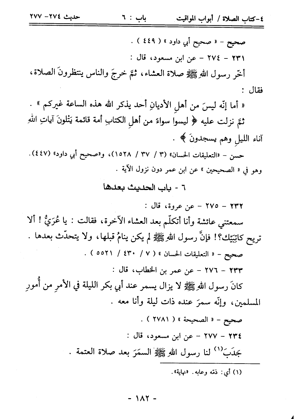 سمعتني عائشة وأنا أتكلّم بعد العشاء الآخرة، فقالت: يا عُرَيُّ! ألا تريح كاتِبَيْك؟! فإنَّ رسول اللهِ - صلى الله عليه وسلم - لم يكن ينامُ قبلها، ولا يتحدّث بعدها.