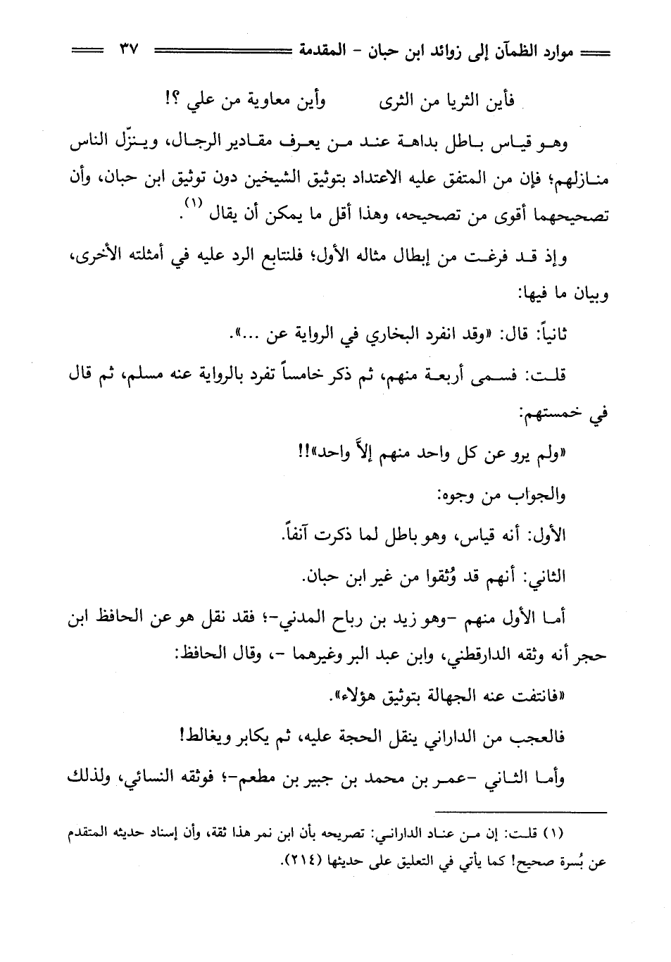 (¬1) قلت: إن من عناد الداراني: تصريحه بأن ابن نمر هذا ثقة، وأن إسناد حديثه المتقدم عن بُسرة صحيح! كما يأتي في التعليق على حديثها (214).