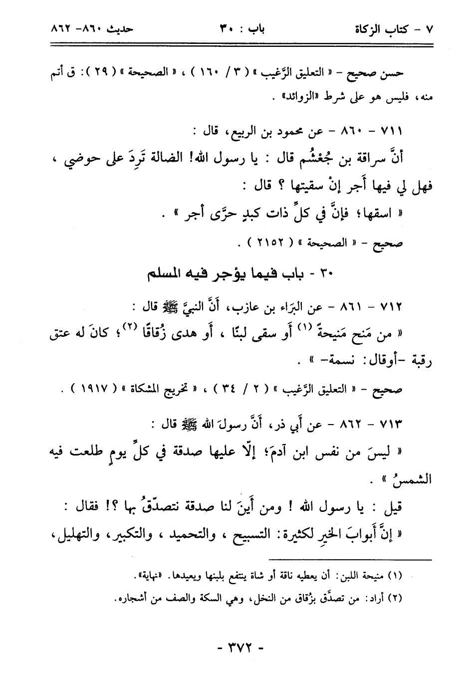 "من مَنح مَنيحةً (¬1) أَو سقى لبنًا، أَو هدى زُقاقًا (¬2)؛ كانَ له عتق رقبة - أو قال: نسمة -".