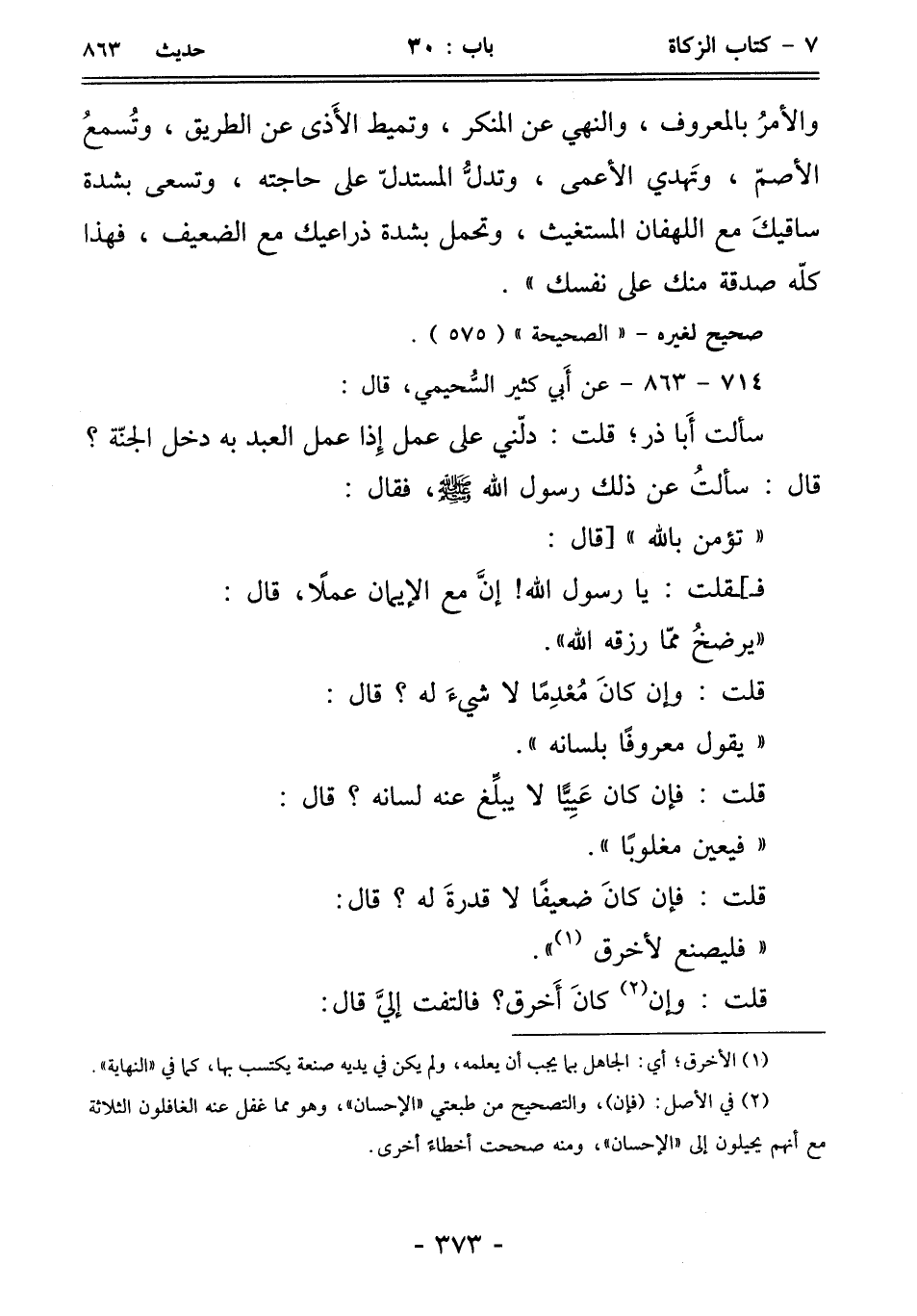 والأمرُ بالمعروف، والنهي عن المنكر، وتميط الأَذى عن الطريق، وتُسمعُ الأصمّ، وتَهدي الأعمى، وتدلُّ المستدلّ على حاجته، وتسعى بشدة ساقيكَ مع اللهفان المستغيث، وتحمل بشدة ذراعيك مع الضعيف، فهذا كلّه صدقة منك على نفسك".