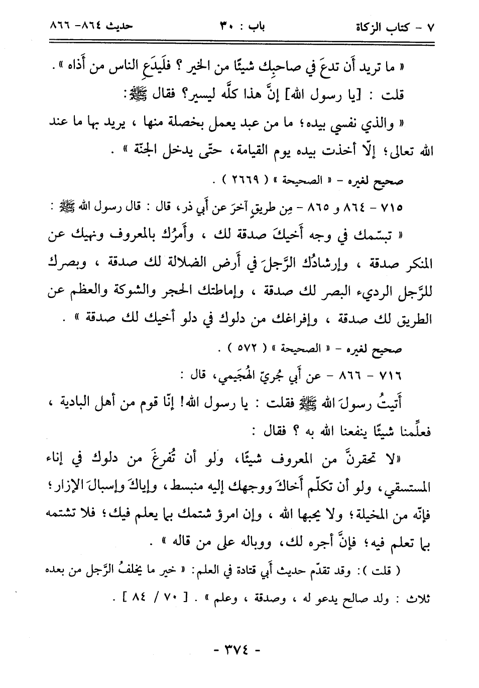 "تبسّمك في وجه أَخيكَ صدقة لك، وأَمرُك بالمعروف ونهيك عن المنكر صدقة، وإرشادُك الرَّجلَ في أَرض الضلالة لك صدقة، وبصرك للرَّجل الرديء البصر لك صدقة، وإماطتك الحجر والشوكة والعظم عن الطريق لك صدقة، وإفراغك من دلوك في دلو أخيك لك صدقة".