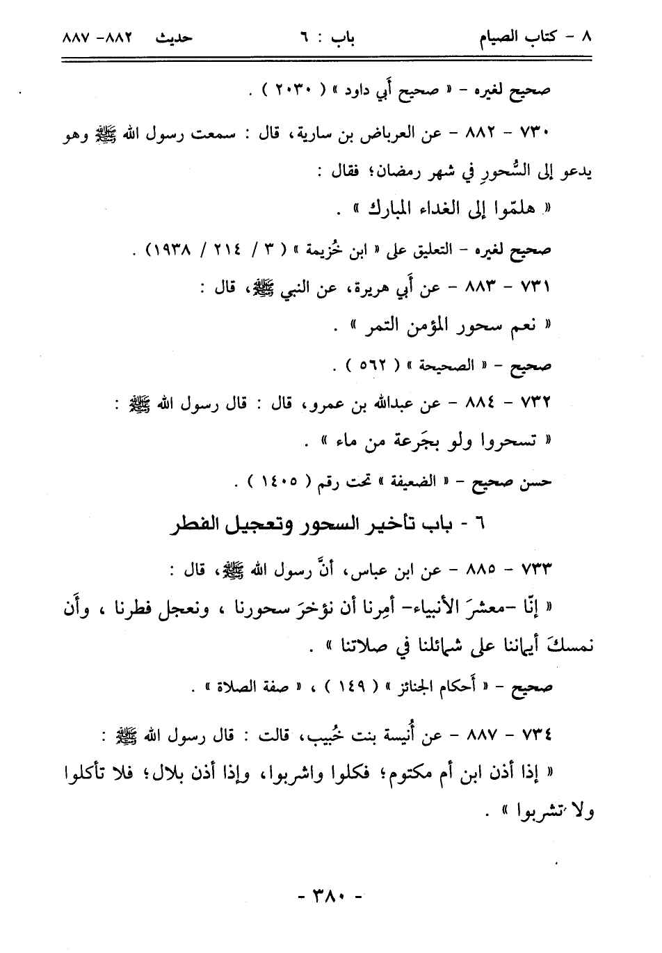 730 - 882 - عن العرباض بن سارية، قال: سمعت رسول الله - صلى الله عليه وسلم - وهو يدعو إلى السُّحورِ في شهر رمضان؛ فقال: