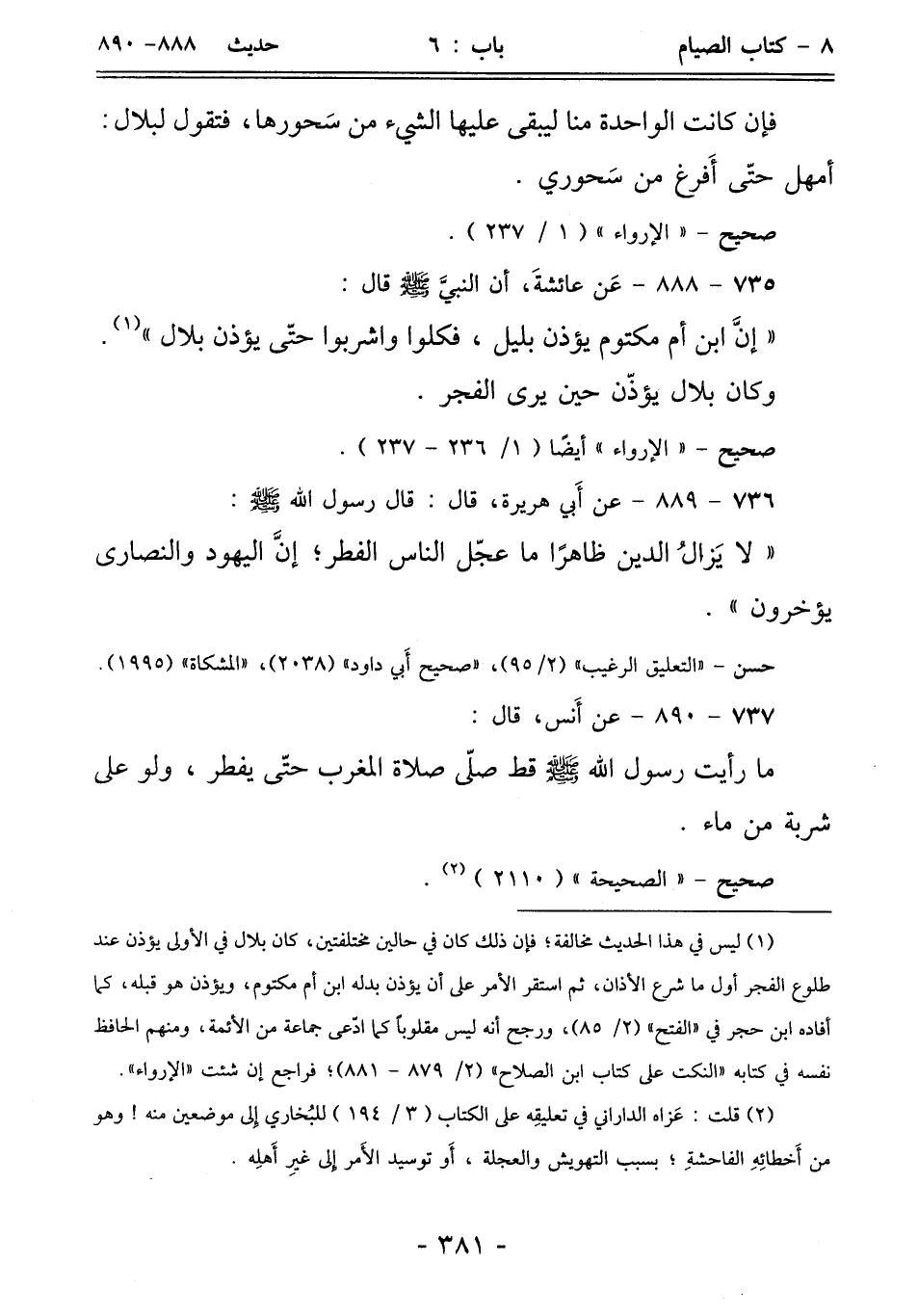 فإن كانت الواحدة منا ليبقى عليها الشيء من سَحورها، فتقول لبلال: أمهل حتّى أَفرغ من سَحوري.