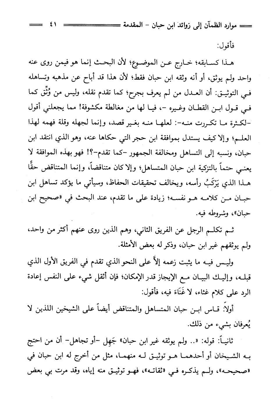 هذا كسابقه؛ خارج عن الموضوع؛ لأن البحث إنما هو فيمن روى عنه واحد ولم يوثق، أو أنه وثقه ابن حبان فقط؛ لأن هذا قد أباح عن مذهبه وتساهله في التوثيق: أن العدل من لم يعرف بجرح؛ كما تقدم نقله، وليس من وُثِّق كما في قول ابن القطان وغيره -، فيا لها من مغالطة مكشوفة! مما يجعلني أقول - لكثرة ما تكررت منه -: لعلها منه بغير قصد، وإنما لجهله وقلة فهمه لهذا العلم؛ وإلا كيف يستدل بموافقة ابن حجر التي حكاها عنه، وهو الذي انتقد ابن حبان، ونسبه إلى التساهل ومخالفة الجمهور - كما تقدم -؟! فهو بهذه الموافقة لا يعني حتمًا بالتزكية ابن حبان المتساهل؛ وإلا كان متناقضًا، وإنما المتناقض حقًّا هذا الذي يَركبُ رأسه، ويخالف تحقيقات الحفاظ، وسيأتي ما يؤكد تساهل ابن حبان من كلامه هو نفسه؛ زيادة على ما تقدم، عند البحث في "صحيح ابن حبان"، وشروطه فيه.