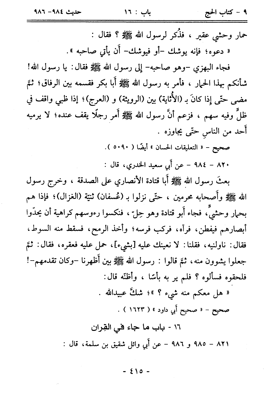 بعثَ رسول الله - صلى الله عليه وسلم - أَبا قتادة الأنصاري على الصَّدقة، وخرج رسول الله - صلى الله عليه وسلم - وأَصحابه محرمين، حتّى نزلوا بـ (عُسفان) ثنيّة (الغزال)؛ فإذا هم بحمار وحشيٍّ، فجاء أَبو قتادة وهو حِلّ، فنكسوا رءوسهم كراهية أنّ يحدّوا أبصارهم فيفطن، فرآه، فركب فرسه؛ وأخذ الرمح، فسقط منه السوط، فقال: ناولنيه، فقلنا: لا نعينك عليه [بشيء]، حمل عليه فعقره، فقال: ثمَّ جعلوا يشوون منه، ثمَّ قالوا: رسول الله - صلى الله عليه وسلم - بين أَظهرنا - وكان تقدمهم -! فلحقوه فسألوه؟ فلم ير به بأسًا، وأظنّه قال: