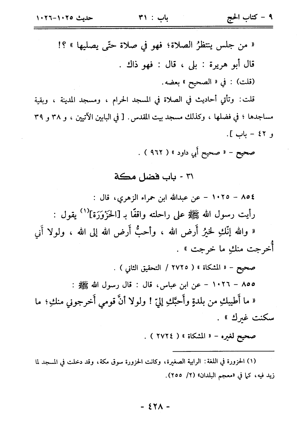 قلت: وتأتي أحاديث في الصّلاة في المسجد الحرام، ومسجد المدينة، وبقية مساجدها؛ في فضلها، وكذلك مسجد بيت المقدس. [في البابين الآتيين، و 38 و 39 و 42 - باب]
