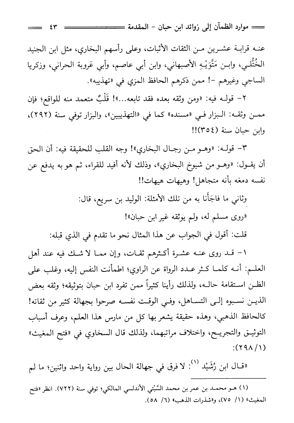 2 - قوله فيه: "ومن وثقه بعده فقد تابعه ... "! قَلْبٌ متعمد منه للواقع؛ فإن ممن وثقه: البزار في "مسنده" كما في "التهذيبين"، والبزار توفي سنة (292)، وابن حبان سنة (354)!!