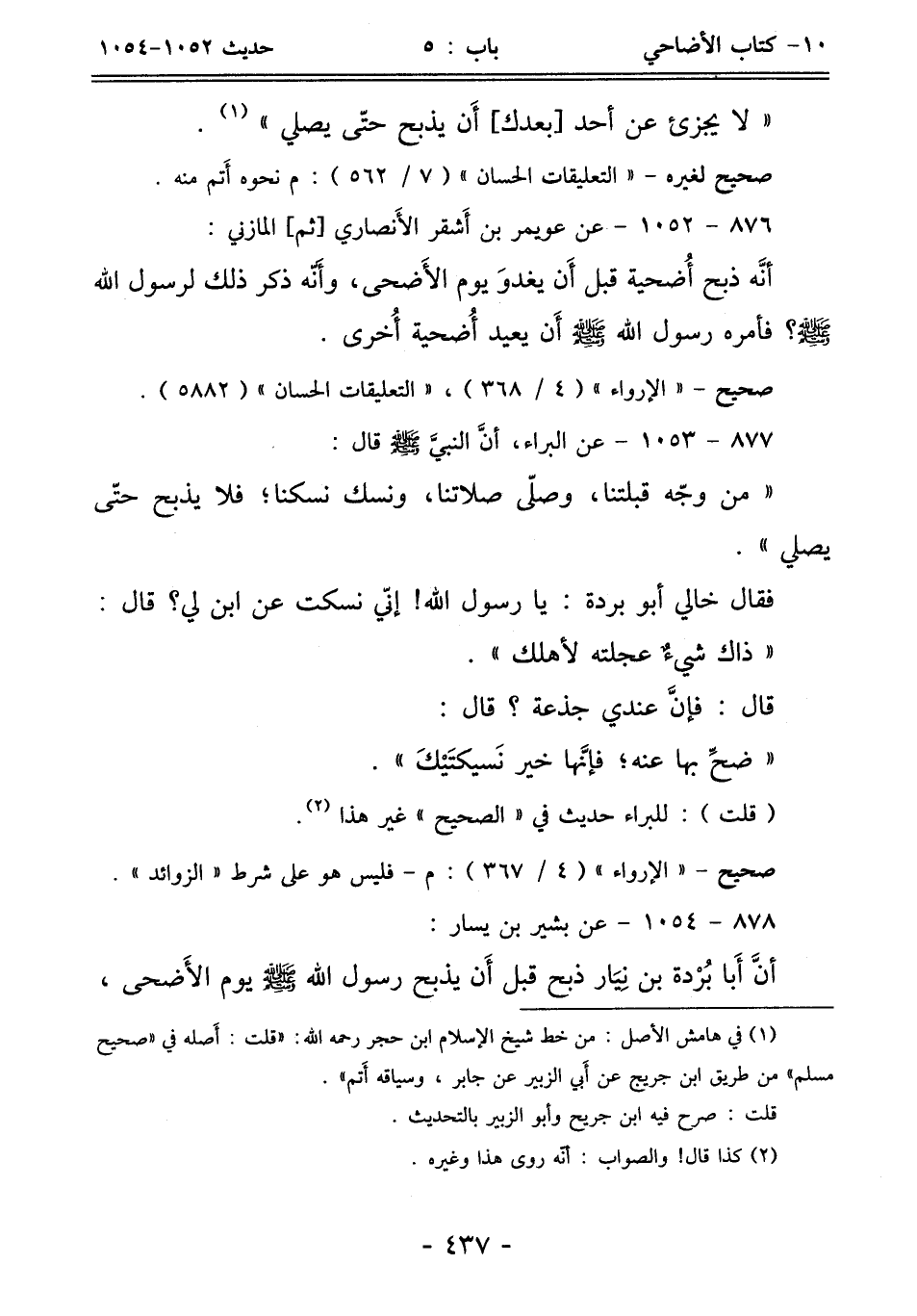 "لا يجزئ عن أحد [بعدك] أَن يذبح حتّى يصلّي" (¬1).