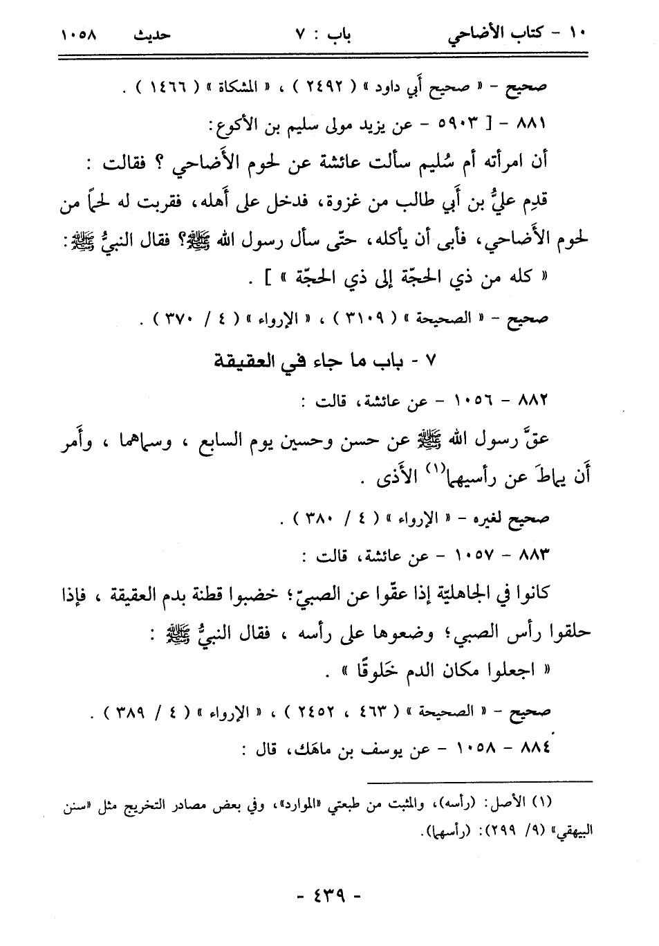 عقَّ رسول الله - صلى الله عليه وسلم - عن حسن وحسين يوم السابع، وسماهما، وأَمر أَن يماطَ عن رأسيهما (¬1) الأَذى.