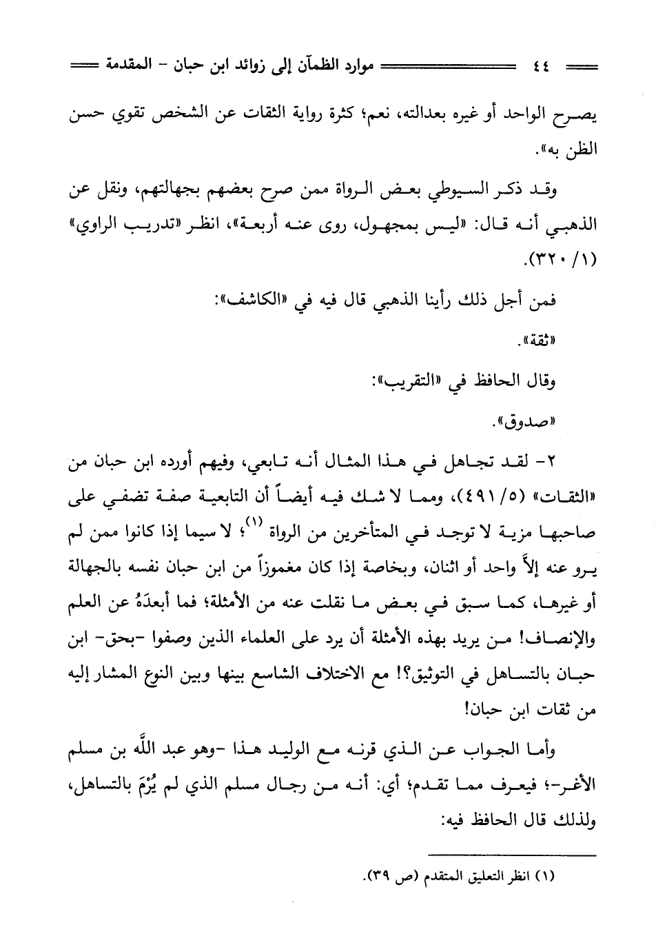 2 - لقد تجاهل في هذا المثال أنه تابعي، وفيهم أورده ابن حبان من "الثقات" (5/ 491)، ومما لا شك فيه أيضًا أن التابعية صفة تضفي على صاحبها مزية لا توجد في المتأخرين من الرواة (¬1)؛ لا سيما إذا كانوا ممن لم يرو عنه إلاَّ واحد أو اثنان، وبخاصة إذا كان مغموزًا من ابن حبان نفسه بالجهالة أو غيرها، كما سبق في بعض ما نقلت عنه من الأمثلة؛ فما أبعدَهُ عن العلم والإنصاف! من يريد بهذه الأمثلة أن يرد على العلماء الذين وصفوا - بحق - ابن حبان بالتساهل في التوثيق؟! مع الاختلاف الشاسع بينها وبين النوع المشار إليه من ثقات ابن حبان!