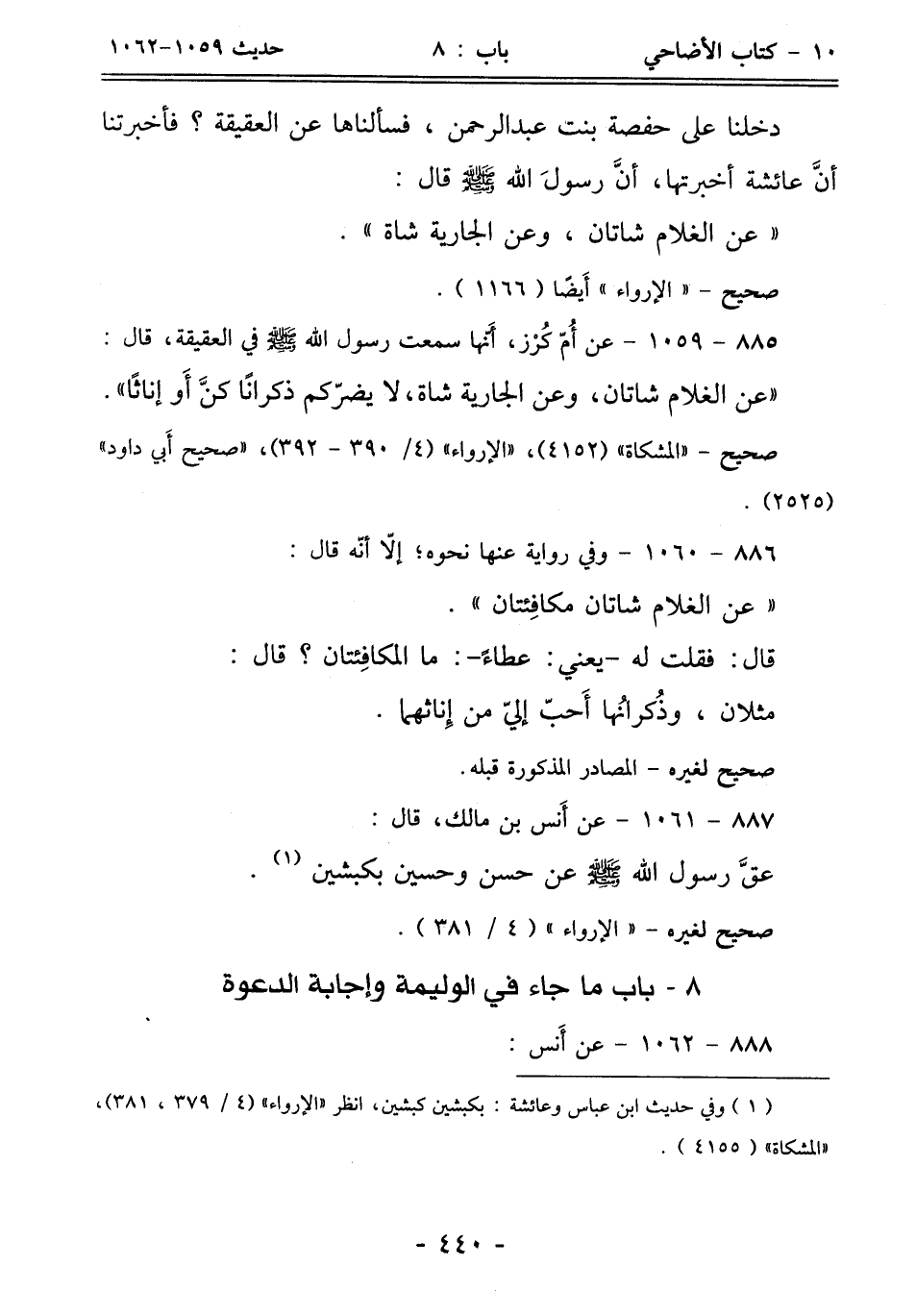 885 - 1059 - عن أُمّ كُرْز، أَنّها سمعت رسول الله - صلى الله عليه وسلم - في العقيقة، قال: