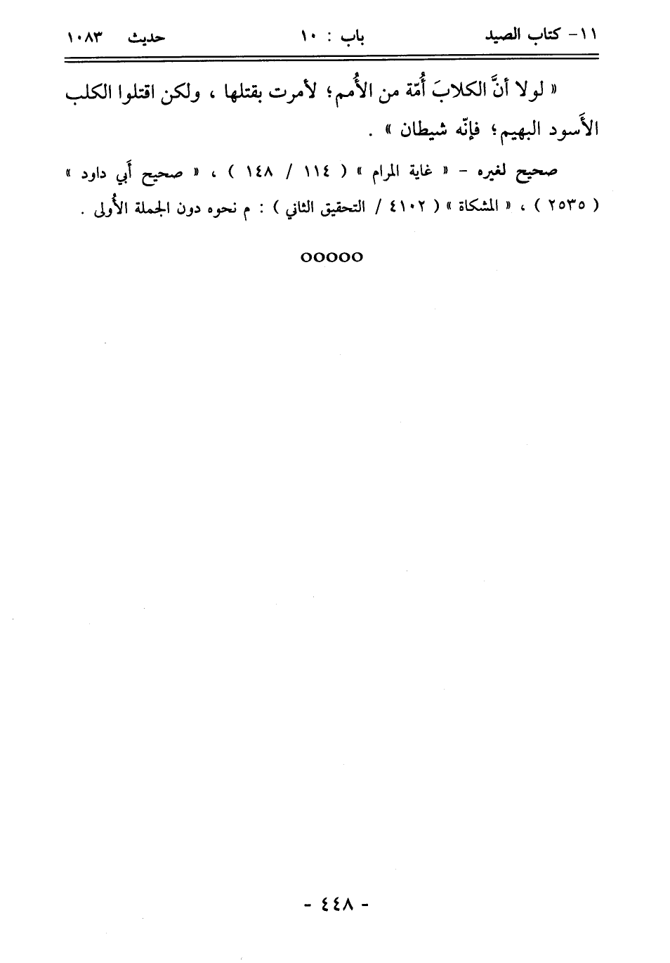 "لولا أنَّ الكلابَ أُمّة من الأُمم؛ لأمرت بقتلها، ولكن اقتلوا الكلب الأَسود البهيم؛ فإنّه شيطان".