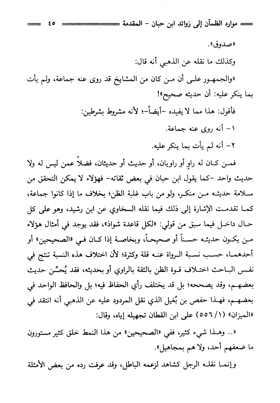 فمن كان له راوٍ أو راويان، أو حديث أو حديثان، فضلًا عمن ليس له ولا حديث واحد - كما يقول ابن حبان في بعض ثقاته - فهؤلاء لا يمكن التحقق من سلامة حديثه من منكر، ولو من باب غلبة الظن؛ بخلاف ما إذا كانوا جماعة، كما تقدمت الإشارة إلى ذلك فيما نقله السخاوي عن ابن رشيد، وهو على كل حال داخل فيما سبق من قولي: "لكل قاعدة شواذ"، فقد يوجد في أمثال هؤلاء من يكون حديثه حسنًا أو صحيحًا، وبخاصة إذا كان في "الصحيحين" أو أحدهما، حسب نسبة الرواة عنه قلة وكثرة؛ لأن اختلاف هذه النسبة تنتج في نفس الباحث اختلاف قوة الظن بالثقة بالراوي أو بحديثه، فقد يُحسِّن حديث بعضهم، وقد يصححه؛ بل قد يختلف رأي الحفاظ فيه؛ بل والحافظ الواحد في بعضهم، فهذا حفص بن بُغيل الذي نقل المردود عليه عن الذهبي أنه انتقد في "الميزان" (1/ 556) على ابن القطان تجهيله إياه، وقال: