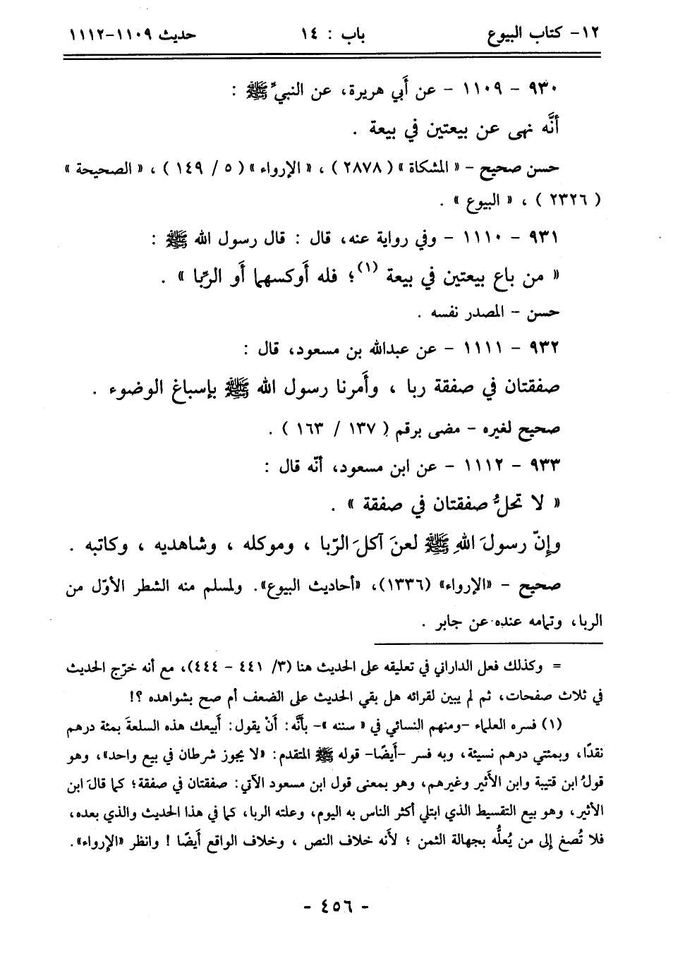 (¬1) فسره العلماء - ومنهم النسائي في "سننه" - بأَنَّه: أَن يقول: أَبيعك هذه السلعةَ بمئة درهم نقدًا، وبمئتي درهم نسيئة، وبه فسر - أَيضًا - قوله - صلى الله عليه وسلم - المتقدم: "لا يجوز شرطان في بيع واحد"، وهو قولُ ابن قتيبة وابن الأَثير وغيرهم، وهو بمعنى قول ابن مسعود الآتي: صفقتان في صفقة؛ كما قالَ ابن الأثير، وهو بيع التقسيط الذي ابتلي أكثر الناس به اليوم، وعلته الربا، كما في هذا الحديث والذي بعده، فلا تُصغ إلى من يُعلُّه بجهالة الثمن؛ لأَنه خلاف النص، وخلاف الواقع أَيضًا! وانظر "الإرواء".