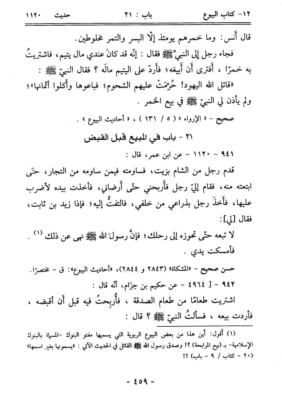 (¬1) أَقول: أَين هذا من بعض البيوع الربوية التي يسميها مفتو البنوك - المسماة بالبنوك الإسلامية - بـ (بيع المرابحة)؟! وصدق رسول الله - صلى الله عليه وسلم - القائل في الحديث الآتي: "يسمونها بغير اسمها" (20 - كتاب/ 9 - باب)!!