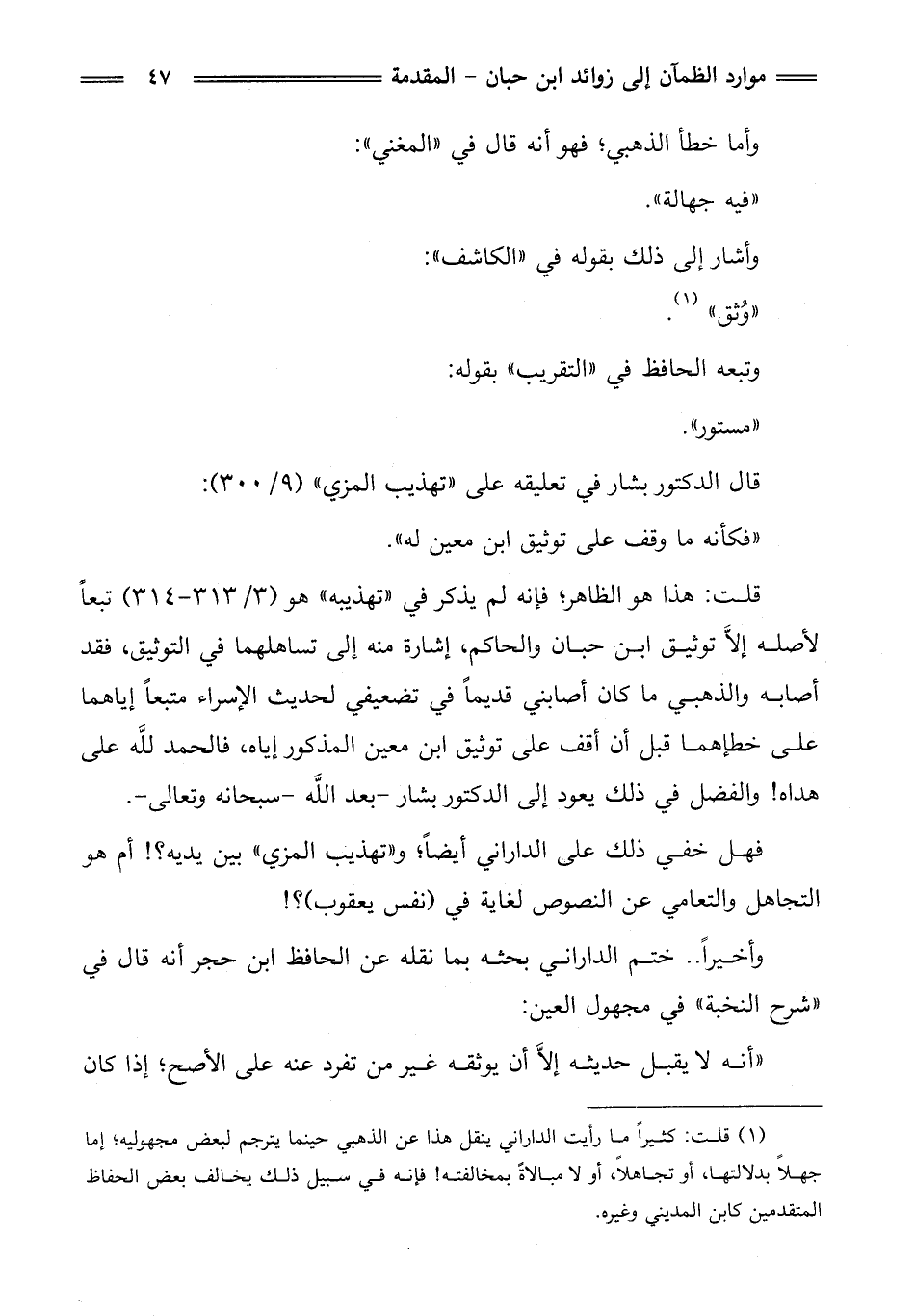 (¬1) قلت: كثيرًا ما رأيت الداراني ينقل هذا عن الذهبي حينما يترجم لبعض مجهوليه؛ إما جهلًا بدلالتها، أو تجاهلًا، أو لا مبالاةً بمخالفته! فإنه في سبيل ذلك يخالف بعض الحفاظ المتقدمين كابن المديني وغيره.