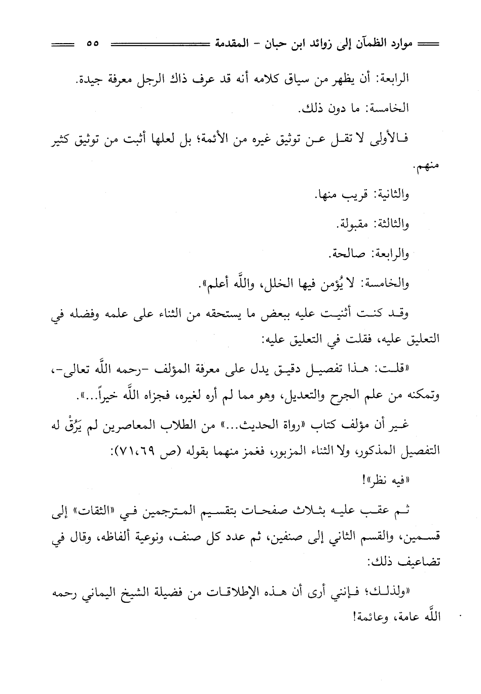 "قلت: هذا تفصيل دقيق يدل على معرفة المؤلف - رحمه اللَّه تعالى -، وتمكنه من علم الجرح والتعديل، وهو مما لم أره لغيره، فجزاه اللَّه خيرًا ... ".