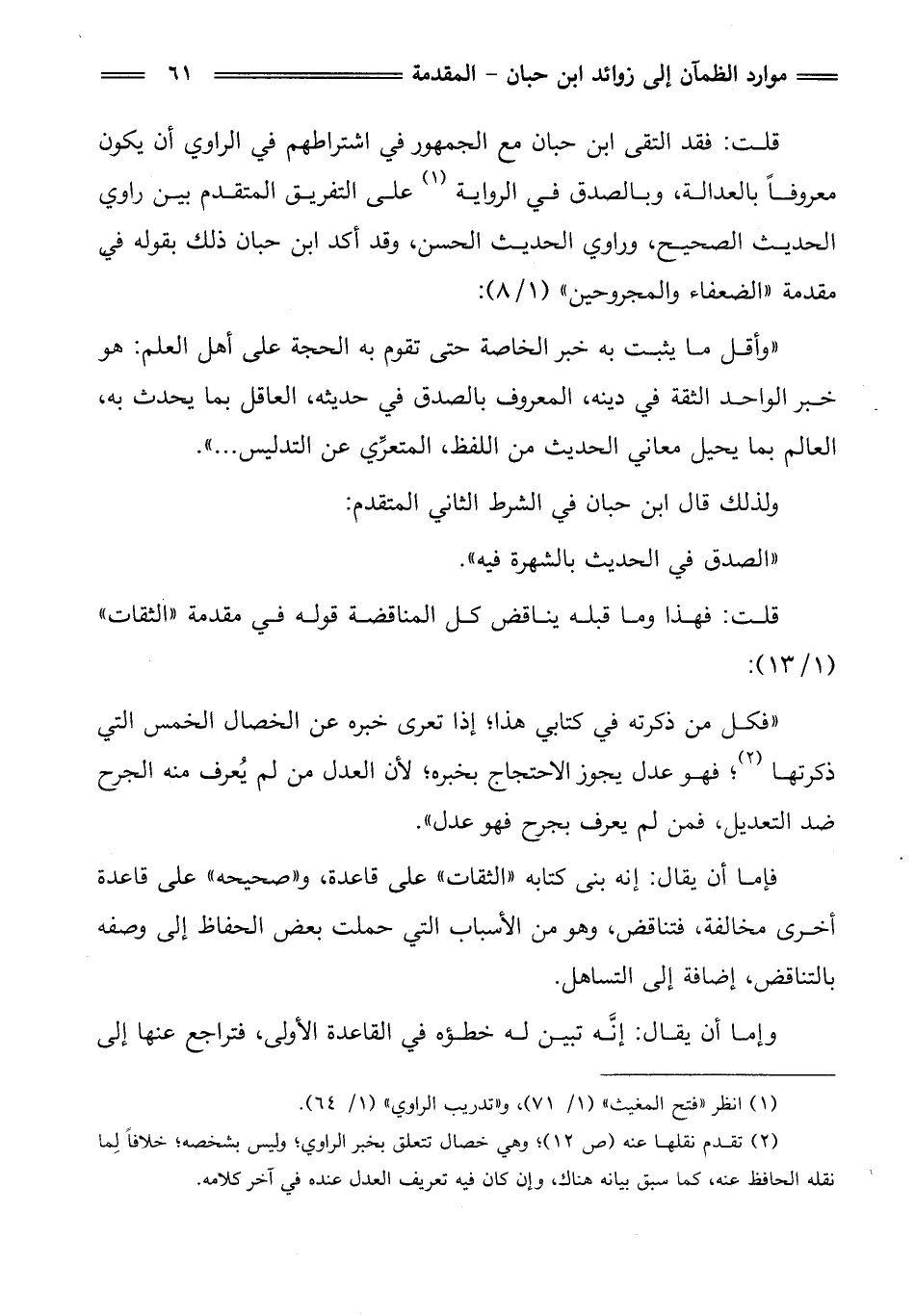 قلت: فقد التقى ابن حبان مع الجمهور في اشتراطهم في الراوي أن يكون معروفًا بالعدالة، وبالصدق في الرواية (¬1) على التفريق المتقدم بين راوي الحديث الصحيح، وراوي الحديث الحسن، وقد أكد ابن حبان ذلك بقوله في مقدمة "الضعفاء والمجروحين" (1/ 8):