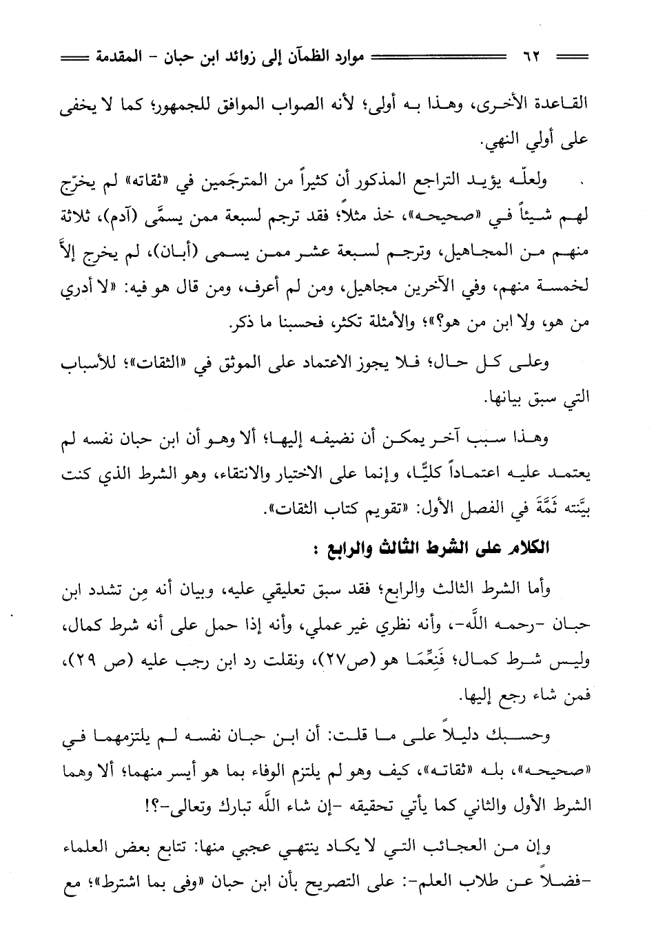 وأما الشرط الثالث والرابع؛ فقد سبق تعليقي عليه، وبيان أنه مِن تشدد ابن حبان - رحمه اللَّه -، وأنه نظري غير عملي، وأنه إذا حمل على أنه شرط كمال، وليس شرط كمال؛ فَنِعِّمَا هو (ص 27)، ونقلت رد ابن رجب عليه (ص 29)، فمن شاء رجع إليها.