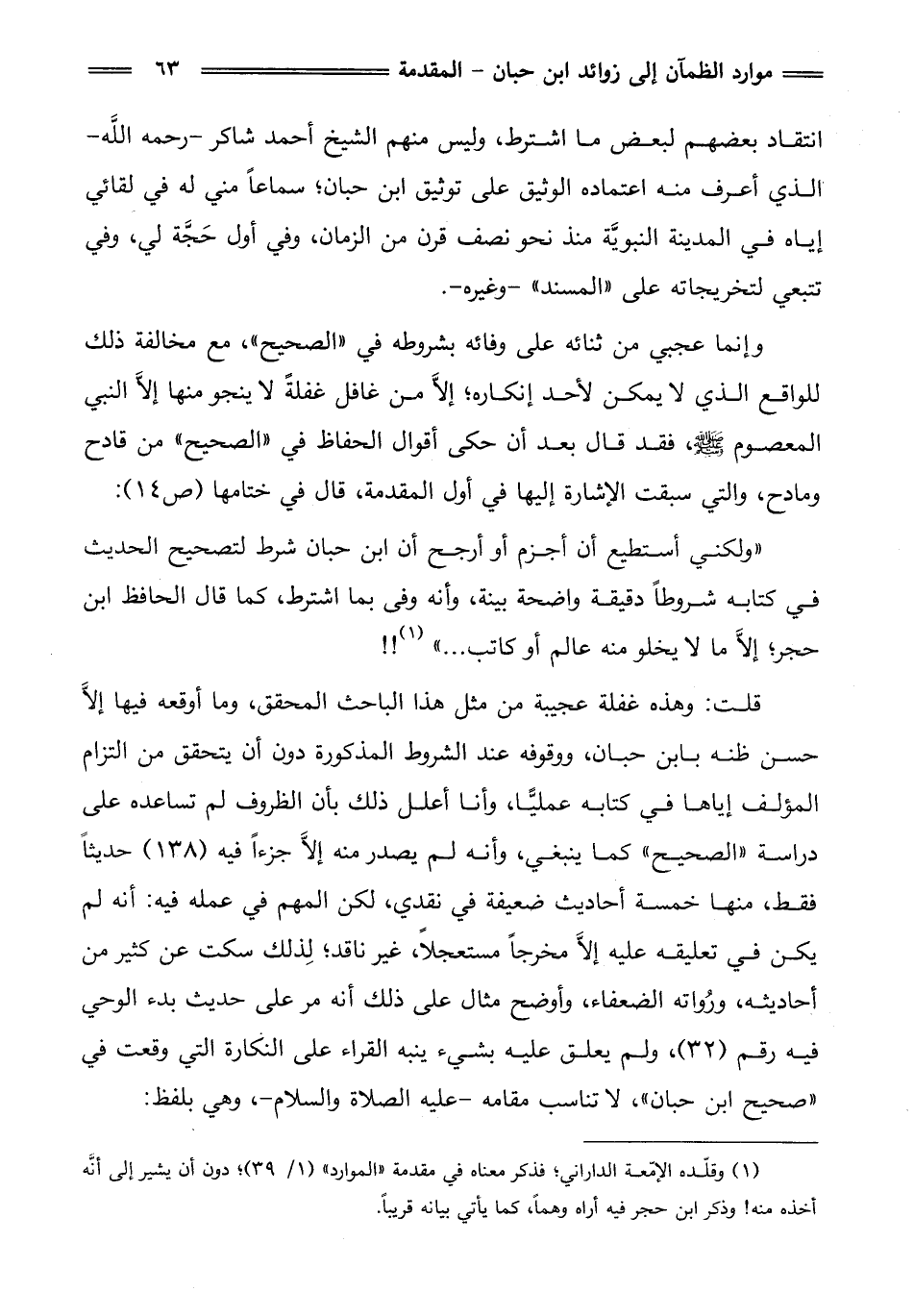"ولكني أستطيع أن أجزم أو أرجح أن ابن حبان شرط لتصحيح الحديث في كتابه شروطًا دقيقة واضحة بينة، وأنه وفى بما اشترط، كما قال الحافظ ابن حجر؛ إلَّا ما لا يخلو منه عالم أو كاتب ... " (¬1)!!