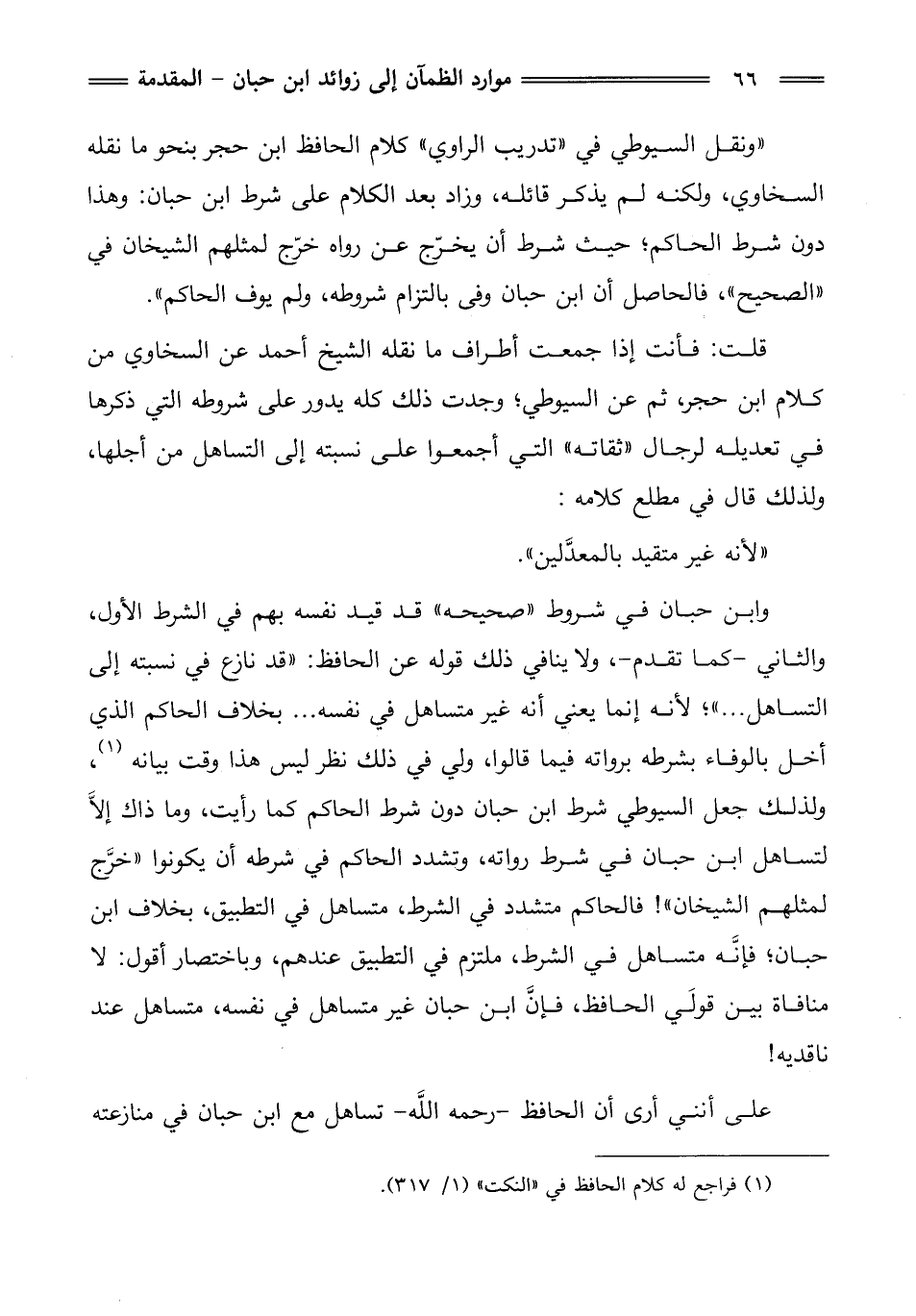 "ونقل السيوطي في "تدريب الراوي" كلام الحافظ ابن حجر بنحو ما نقله السخاوي، ولكنه لم يذكر قائله، وزاد بعد الكلام على شرط ابن حبان: وهذا دون شرط الحاكم؛ حيث شرط أن يخرّج عن رواه خرّج لمثلهم الشيخان في "الصحيح"، فالحاصل أن ابن حبان وفى بالتزام شروطه، ولم يوف الحاكم".