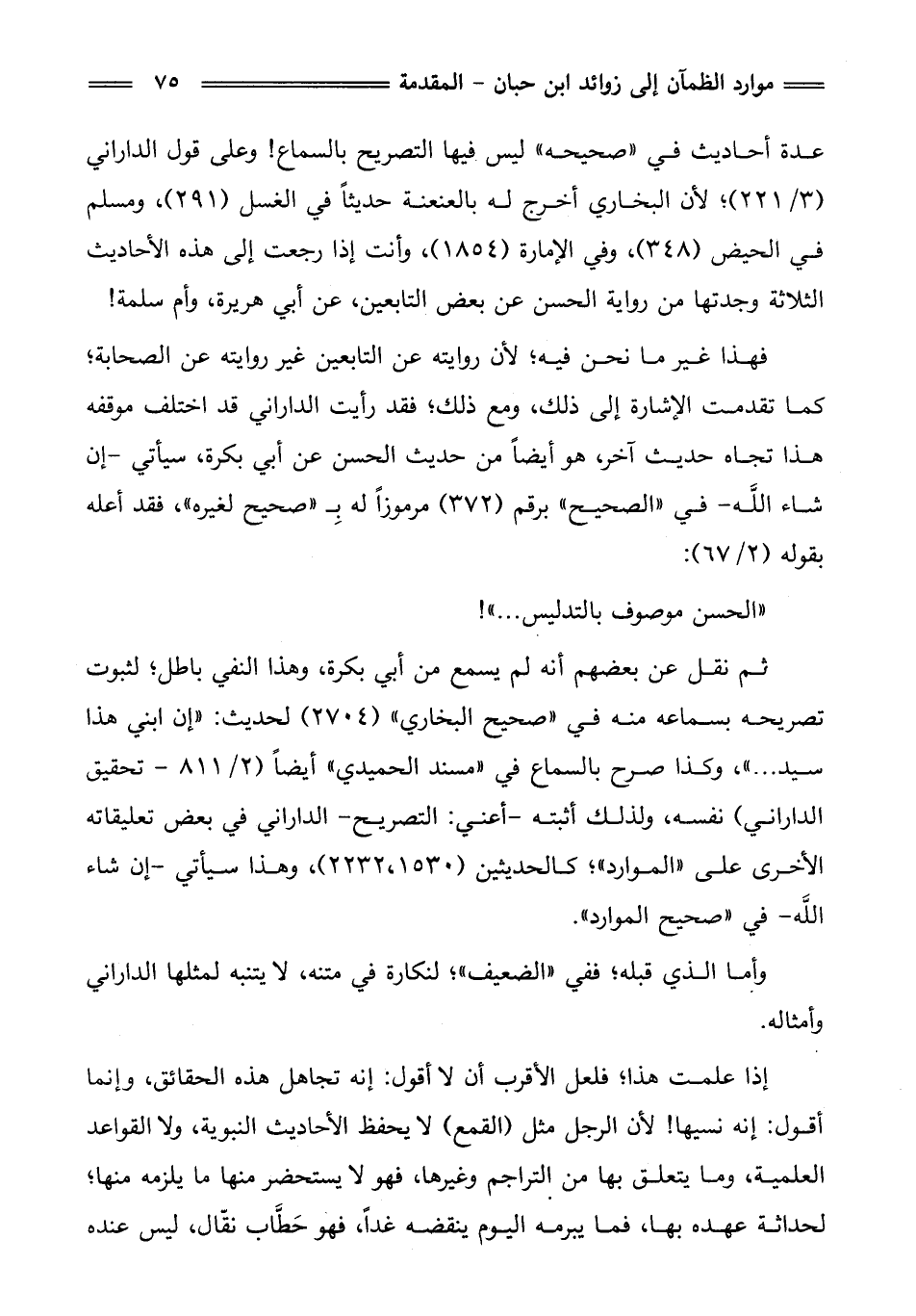 ثم نقل عن بعضهم أنه لم يسمع من أبي بكرة، وهذا النفي باطل؛ لثبوت تصريحه بسماعه منه في "صحيح البخاري" (2704) لحديث: "إن ابني هذا سيد ... "، وكذا صرح بالسماع في "مسند الحميدي" أيضًا (2/ 811 - تحقيق الداراني) نفسه، ولذلك أثبته - أعني: التصريح - الداراني في بعض تعليقاته الأخرى على "الموارد"؛ كالحديثين (1530, 2232)، وهذا سيأتي - إن شاء اللَّه - في "صحيح الموارد".