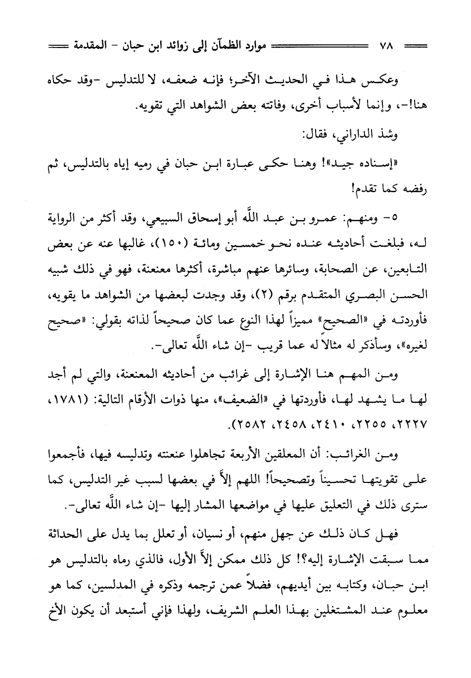 5 - ومنهم: عمرو بن عبد اللَّه أبو إسحاق السبيعي، وقد أكثر من الرواية له، فبلغت أحاديثه عنده نحو خمسين ومائة (150)، غالبها عنه عن بعض التابعين، عن الصحابة، وسائرها عنهم مباشرة، أكثرها معنعنة، فهو في ذلك شبيه الحسن البصري المتقدم برقم (2)، وقد وجدت لبعضها من الشواهد ما يقويه، فأوردته في "الصحيح" مميزًا لهذا النوع عما كان صحيحًا لذاته بقولي: "صحيح لغيره"، وسأذكر له مثالًا له عما قريب - إن شاء اللَّه تعالى -.