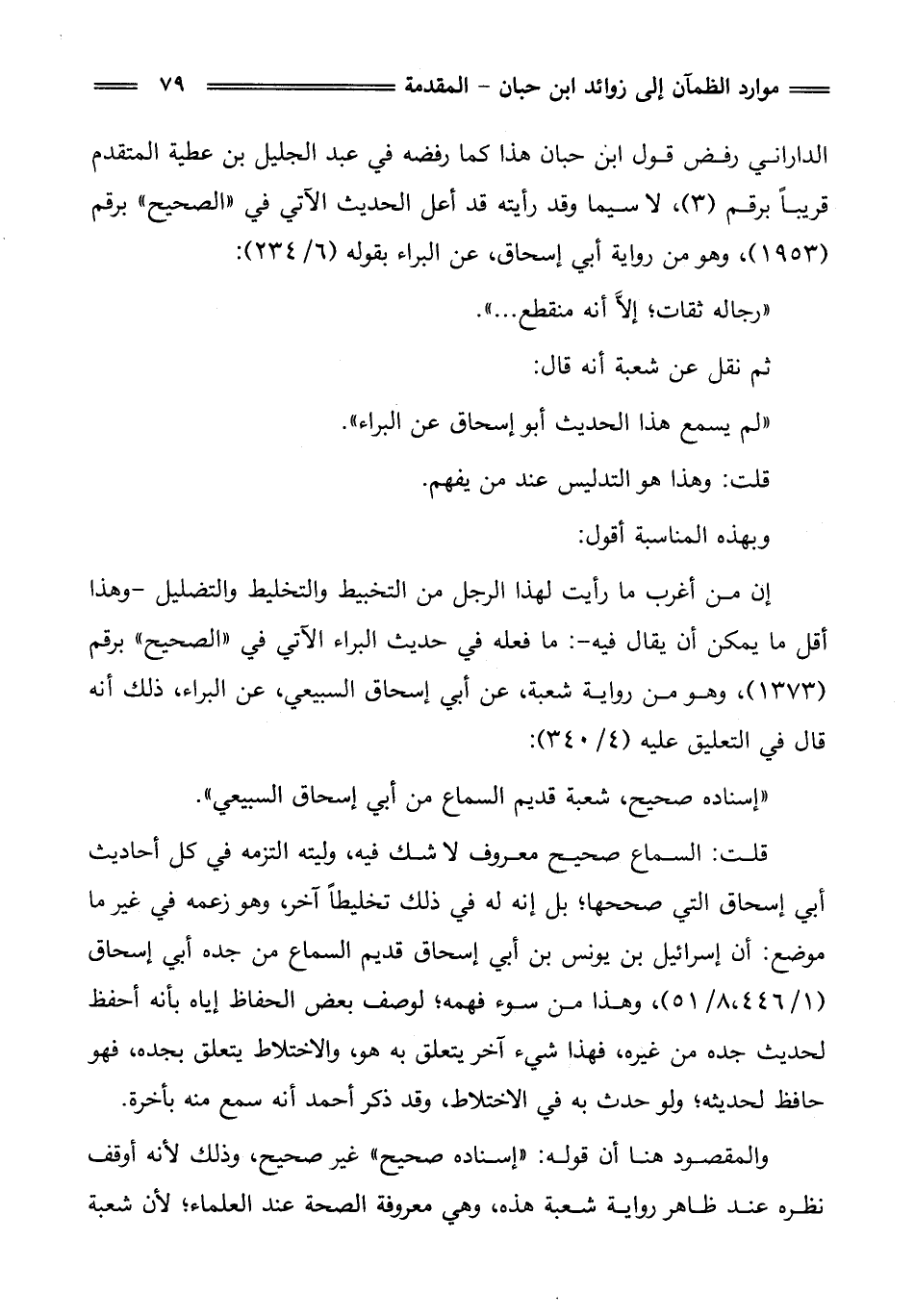 قلت: السماع صحيح معروف لا شك فيه، وليته التزمه في كل أحاديث أبي إسحاق التي صححها؛ بل إنه له في ذلك تخليطًا آخر، وهو زعمه في غير ما موضع: أن إسرائيل بن يونس بن أبي إسحاق قديم السماع من جده أبي إسحاق (1/ 446, 8/ 51)، وهذا من سوء فهمه؛ لوصف بعض الحفاظ إياه بأنه أحفظ لحديث جده من غيره، فهذا شيء آخر يتعلق به هو، والاختلاط يتعلق بجده، فهو حافظ لحديثه؛ ولو حدث به في الاختلاط، وقد ذكر أحمد أنه سمع منه بأخرة.