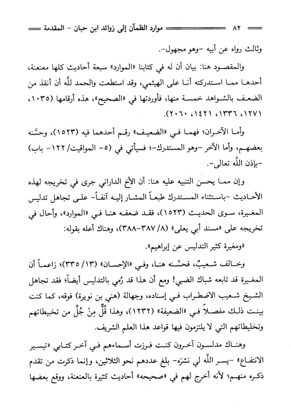 والمقصود هنا: بيان أن له في كتابنا "الموارد" سبعة أحاديث كلها معنعنة، أحدها مما استدركته أنا على الهيثمي، وقد استطعت والحمد للَّه أن أنقذ من الضعف بالشواهد خمسة منها، فأوردتها في "الصحيح"، هذه أرقامها (1035، 1271، 1336، 1421، 2060).