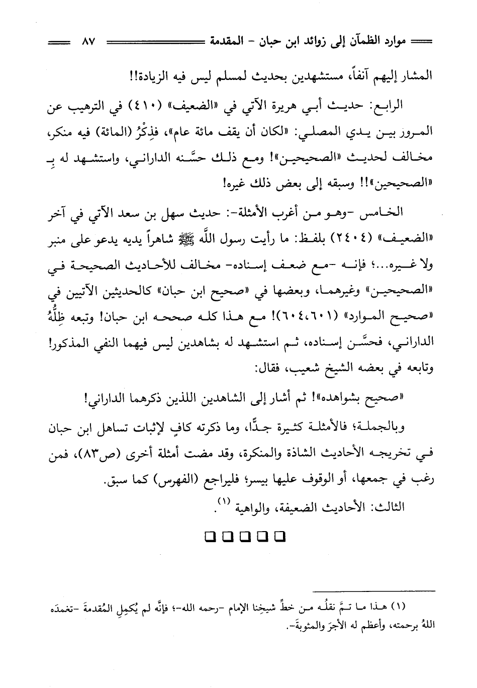 وبالجملة؛ فالأمثلة كثيرة جدًّا، وما ذكرته كافٍ لإثبات تساهل ابن حبان في تخريجه الأحاديث الشاذة والمنكرة، وقد مضت أمثلة أخرى (ص 83)، فمن رغب في جمعها، أو الوقوف عليها بيسر؛ فليراجع (الفهرس) كما سبق.
