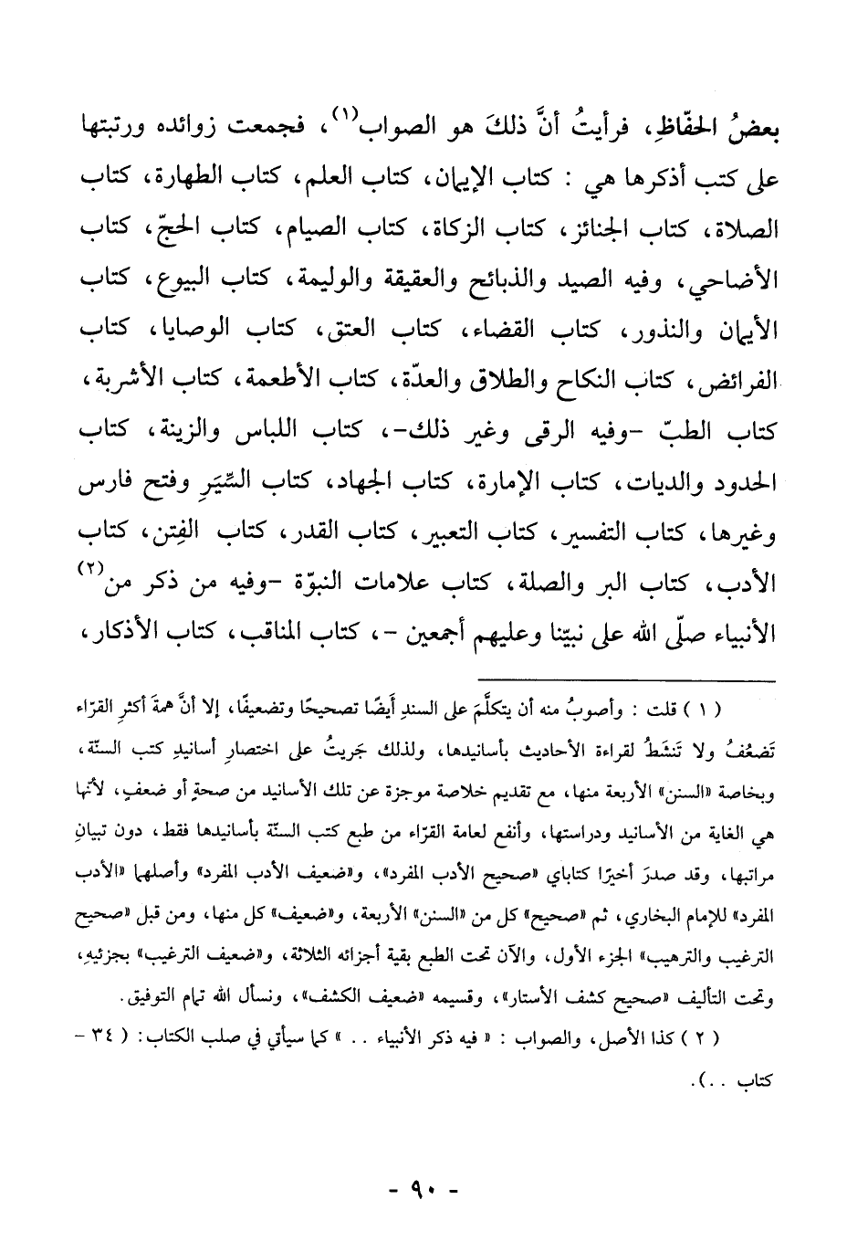 (¬1) قلت: وأصوبُ منه أن يتكلَّمَ على السندِ أَيضًا تصحيحًا وتضعيفًا، إلا أنَّ همةَ أكثرِ القرّاء تَضعُفُ ولا تَنشَطُ لقراءة الأحاديث بأسانيدها، ولذلك جَريتُ على اختصارِ أسانيدِ كتب السنّة، وبخاصة "السنن" الأربعة منها، مع تقديم خلاصة موجزة عن تلك الأسانيد من صحةٍ أو ضعفٍ، لأنّها هي الغاية من الأسانيد ودراستها، وأنفع لعامة القرّاء من طبع كتب السنّة بأسانيدها فقط، دون تبيانِ مراتبها، وقد صدرَ أخيرًا كتاباي "صحيح الأدب المفرد"، و"ضعيف الأدب المفرد" وأصلهما "الأدب المفرد" للإمام البخاري، ثم "صحيح" كل من "السنن" الأربعة، و"ضعيف" كل منها، ومن قبل "صحيح الترغيب والترهيب" الجزء الأول، والآن تحت الطبع بقية أجزائه الثلاثة، و"ضعيف الترغيب" بجزئيهِ، وتحت التأليف "صحيح كشف الأستار"، وقسيمه "ضعيف الكشف"، ونسأل الله تمام التوفيق.