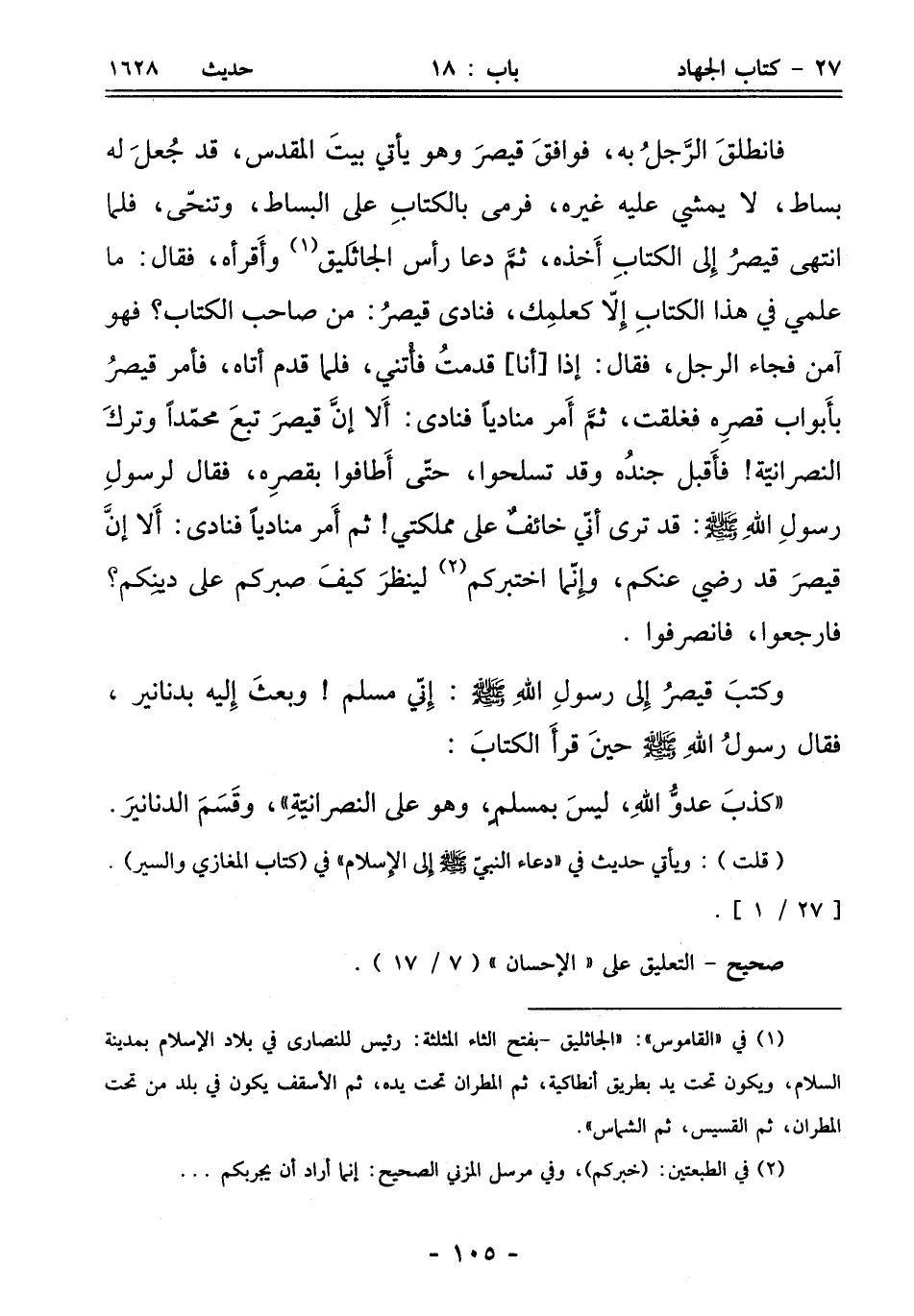 فانطلقَ الرَّجلُ به، فوافقَ قيصرَ وهو يأتي بيتَ المقدس، قد جُعلَ له بساط، لا يمشي عليه غيره، فرمى بالكتابِ على البساط، وتنحّى، فلما انتهى قيصرُ إِلى الكتابِ أَخذه، ثمَّ دعا رأس الجاثَليق (¬1) وأَقرأه، فقال: ما علمي في هذا الكتابِ إِلّا كعلمِك، فنادى قيصرُ: من صاحب الكتاب؟ فهو آمن فجاء الرجل، فقال: إذا [أنا] قدمتُ فأْتني، فلما قدم أتاه، فأمر قيصرُ بأَبواب قصرِه فغلقت، ثمَّ أَمر مناديًا فنادى: أَلا إنَّ قيصرَ تبعَ محمّدًا وتركَ النصرانيّة! فأَقبل جندُه وقد تسلحوا، حتّى أَطافوا بقصرِه، فقال لرسولِ رسولِ اللهِ - صلى الله عليه وسلم -: قد ترى أنّي خائفٌ على مملكتي! ثم أَمر مناديًا فنادى: أَلا إنَّ قيصرَ قد رضي عنكم، وإِنّما اختبركم (¬2) لينظرَ كيفَ صبركم على دينِكم؟ فارجعوا، فانصرفوا.