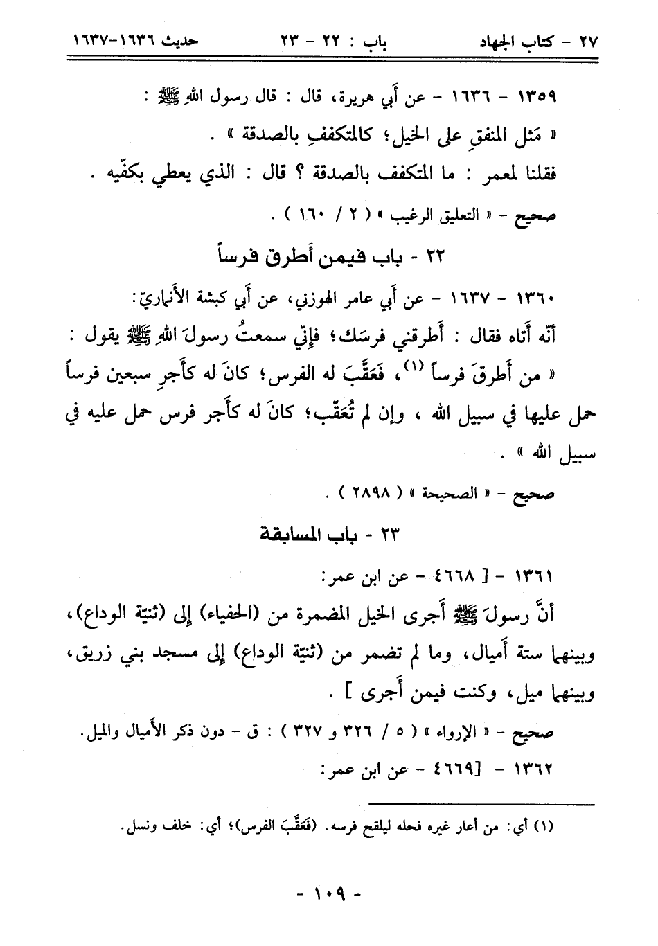 أنَّ رسولَ - صلى الله عليه وسلم - أَجرى الخيل المضمرة من (الحفياء) إِلى (ثنيّة الوداع)، وبينهما ستة أَميال، وما لم تضمر من (ثنيّة الوداع) إِلى مسجد بني زريق، وبينهما ميل، وكنت فيمن أَجرى].