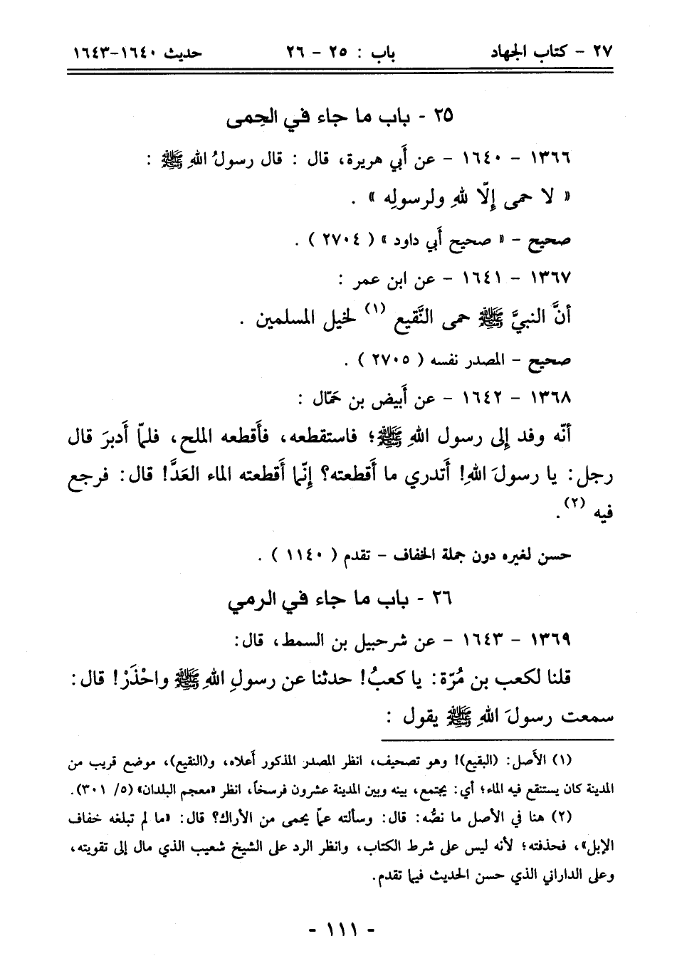 (¬2) هنا في الأصل ما نصُّه: قال: وسألته عمّا يحمى من الأراك؟ قال: "ما لم تبلغه خفاف الإبل"، فحذفته؛ لأنه ليس على شرط الكتاب، وانظر الرد على الشيخ شعيب الذي مال إلى تقويته، وعلى الداراني الذي حسن الحديث فيما تقدم.