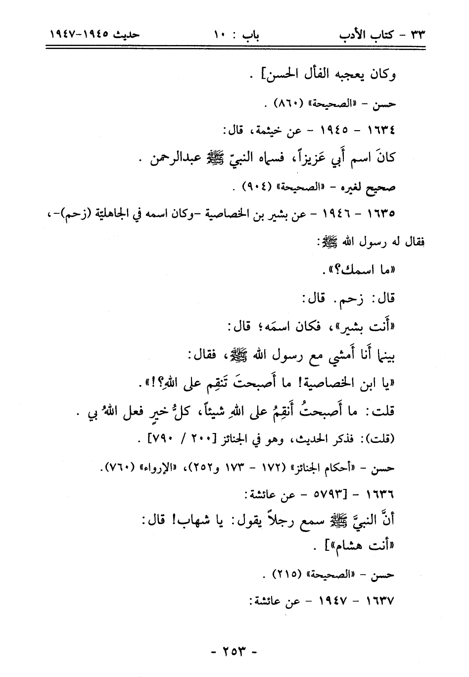 1635 - 1946 - عن بشير بن الخصاصية - وكان اسمه في الجاهليّة (زحم) -، فقال له رسول الله - صلى الله عليه وسلم -: