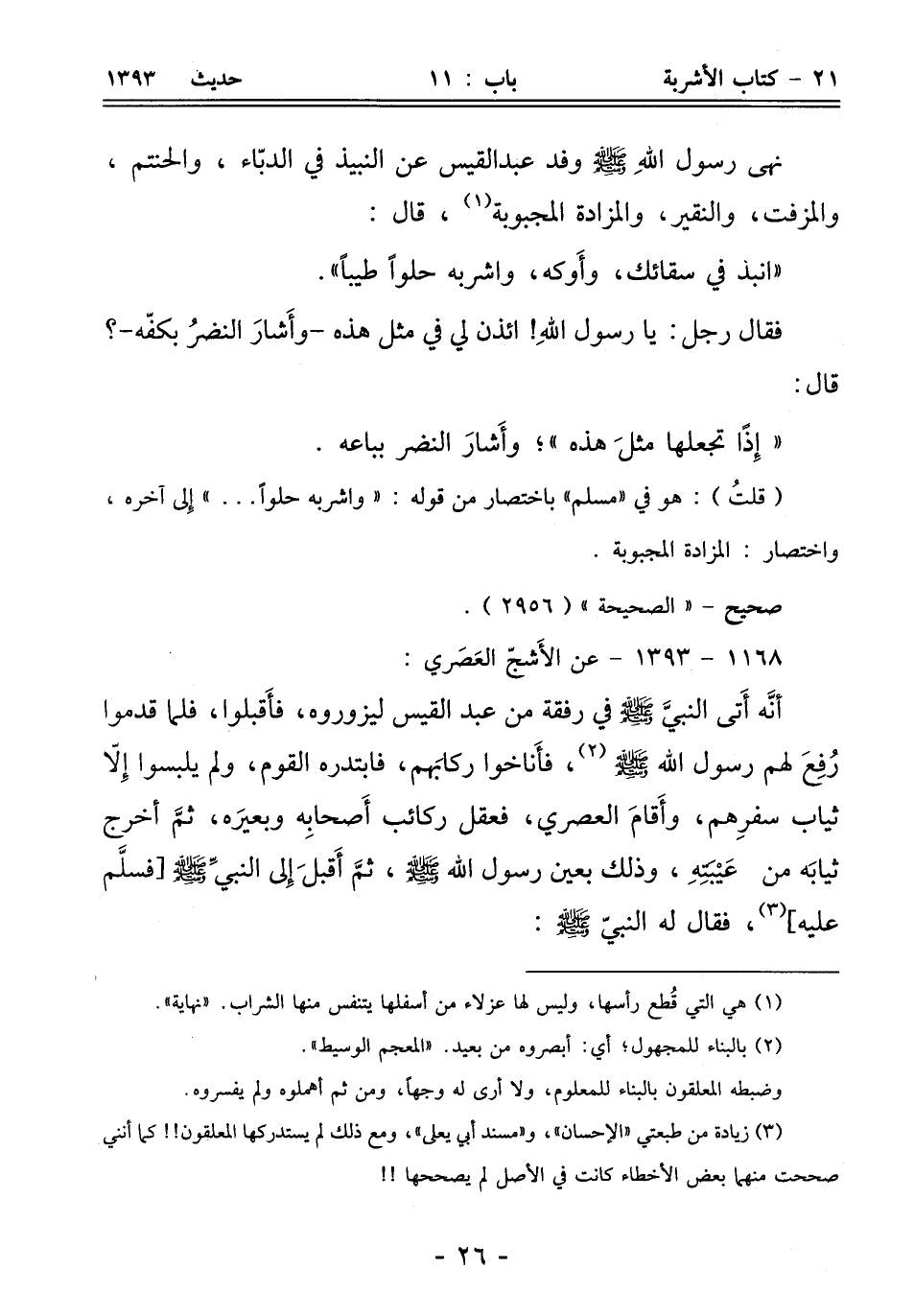 نهى رسول اللهِ - صلى الله عليه وسلم - وفد عبد القيس عن النبيذ في الدبّاء، والحنتم، والمزفت، والنقير، والمزادة المجبوبة (¬1)، قال: