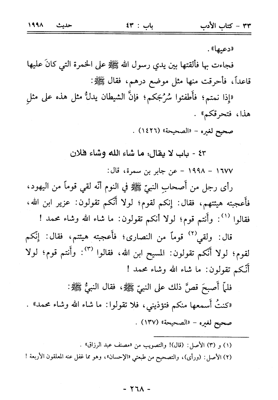 "كنتُ أَسمعها منكم فتؤذيني، فلا تقولوا: ما شاء الله وشاء محمد".