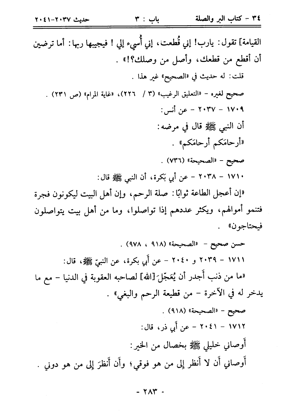 "ما من ذنب أَجدر أن يُعَجّلَ [الله] لصاحبه العقوبة في الدنيا - مع ما يدخر له في الآخرة - من قطيعة الرحم والبغي".