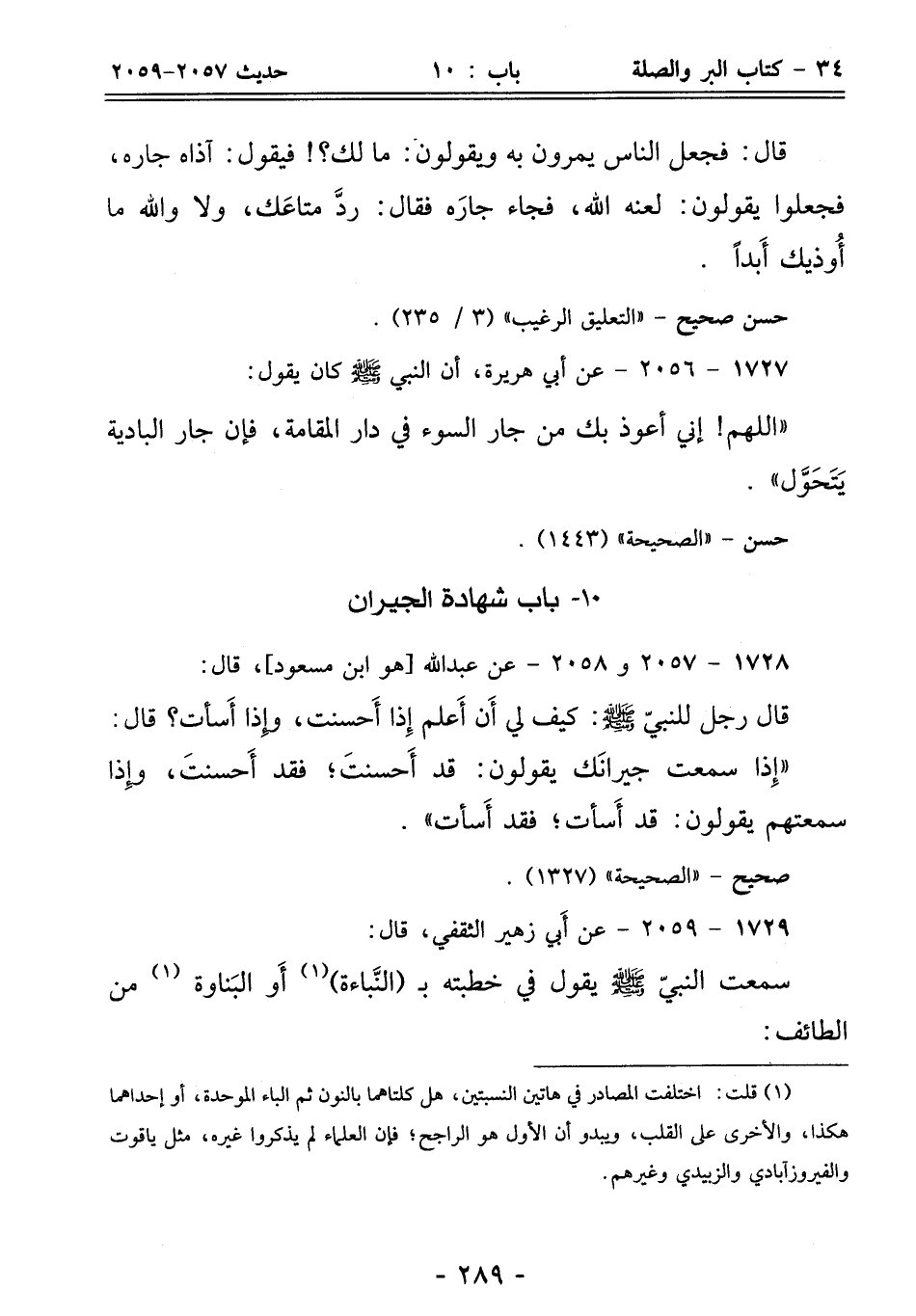قال: فجعل الناس يمرون به ويقولون: ما لك؟! فيقول: آذاه جاره، فجعلوا يقولون: لعنه الله، فجاء جارَه فقال: ردَّ متاعَك، ولا والله ما أُوذيك أَبدًا