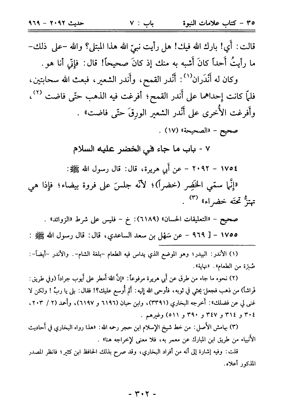 "إِنَّما سمّي الخَضِر (خضرًا)؛ لأنّه جلسَ على فروة بيضاء؛ فإِذا هي تهتزُّ تحتَه خضراء" (¬3).