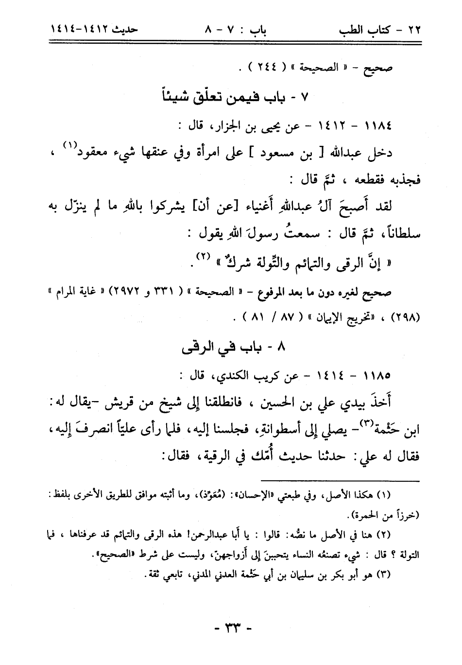 (¬2) هنا في الأصل ما نصُّه: قالوا: يا أَبا عبد الرحمن! هذه الرقى والتمائم قد عرفناها، فما التولة؟ قال: شيء تصنعُه النساء يتحببنَ إلى أَزواجهنّ، وليست على شرط "الصحيح".