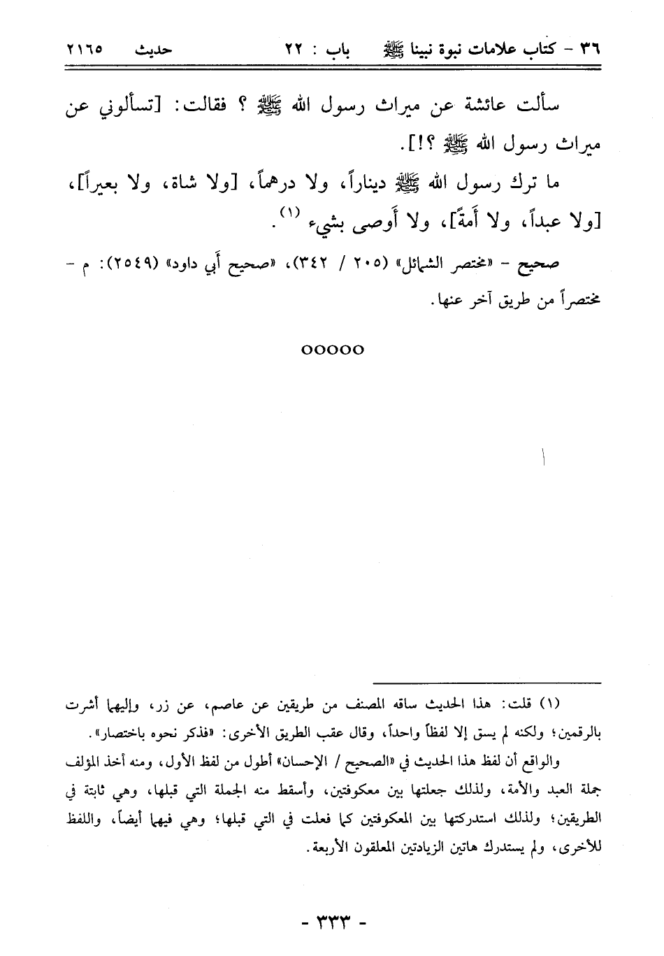 سألت عائشة عن ميراث رسول الله - صلى الله عليه وسلم -؟ فقالت: [تسألوني عن ميراث رسول الله - صلى الله عليه وسلم -؟!].