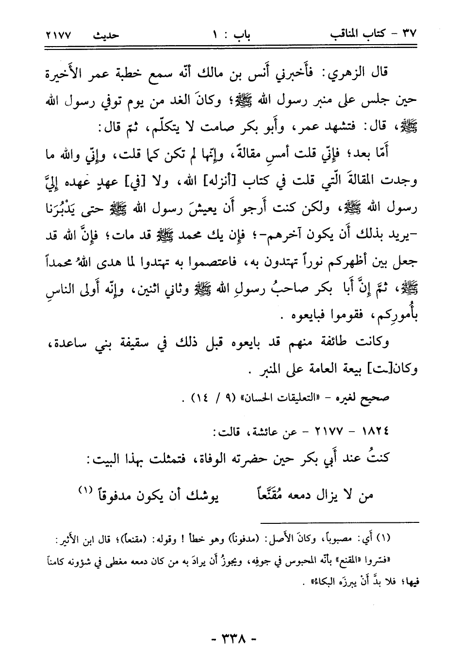قال الزهري: فأَخبرني أَنس بن مالك أنّه سمع خطبة عمر الأَخيرة حين جلس على منبر رسول الله - صلى الله عليه وسلم -؛ وكانَ الغد من يوم توفي رسول الله - صلى الله عليه وسلم -، قال: فتشهد عمر، وأَبو بكر صامت لا يتكلّم، ثمّ قال: