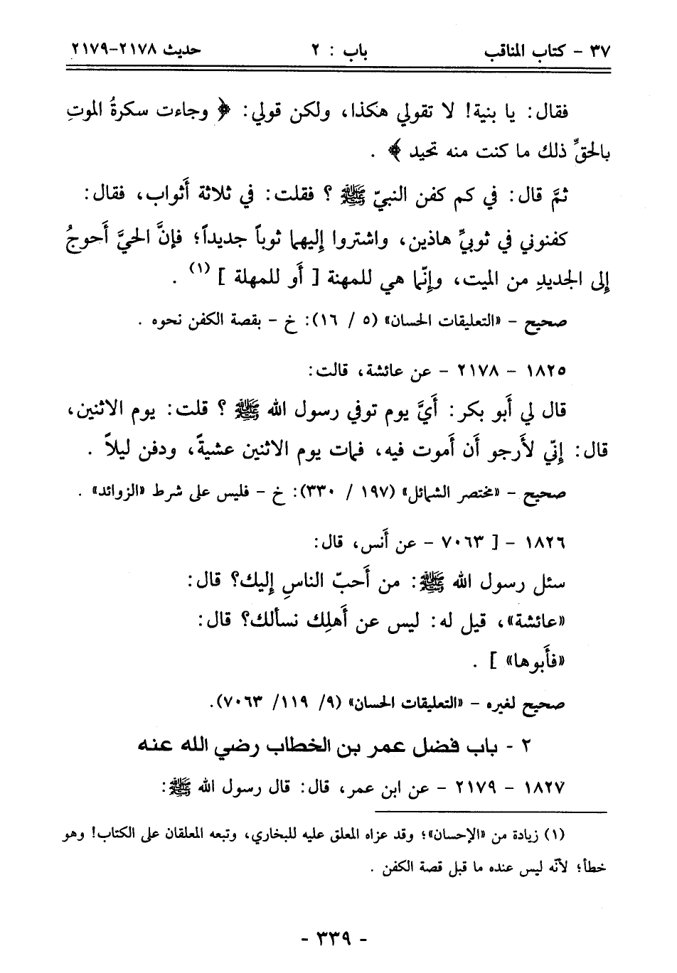 (¬1) زيادة من "الإحسان"؛ وقد عزاه المعلق عليه للبخاري، وتبعه المعلقان على الكتاب! وهو خطأ؛ لأنّه ليس عنده ما قبل قصة الكفن.