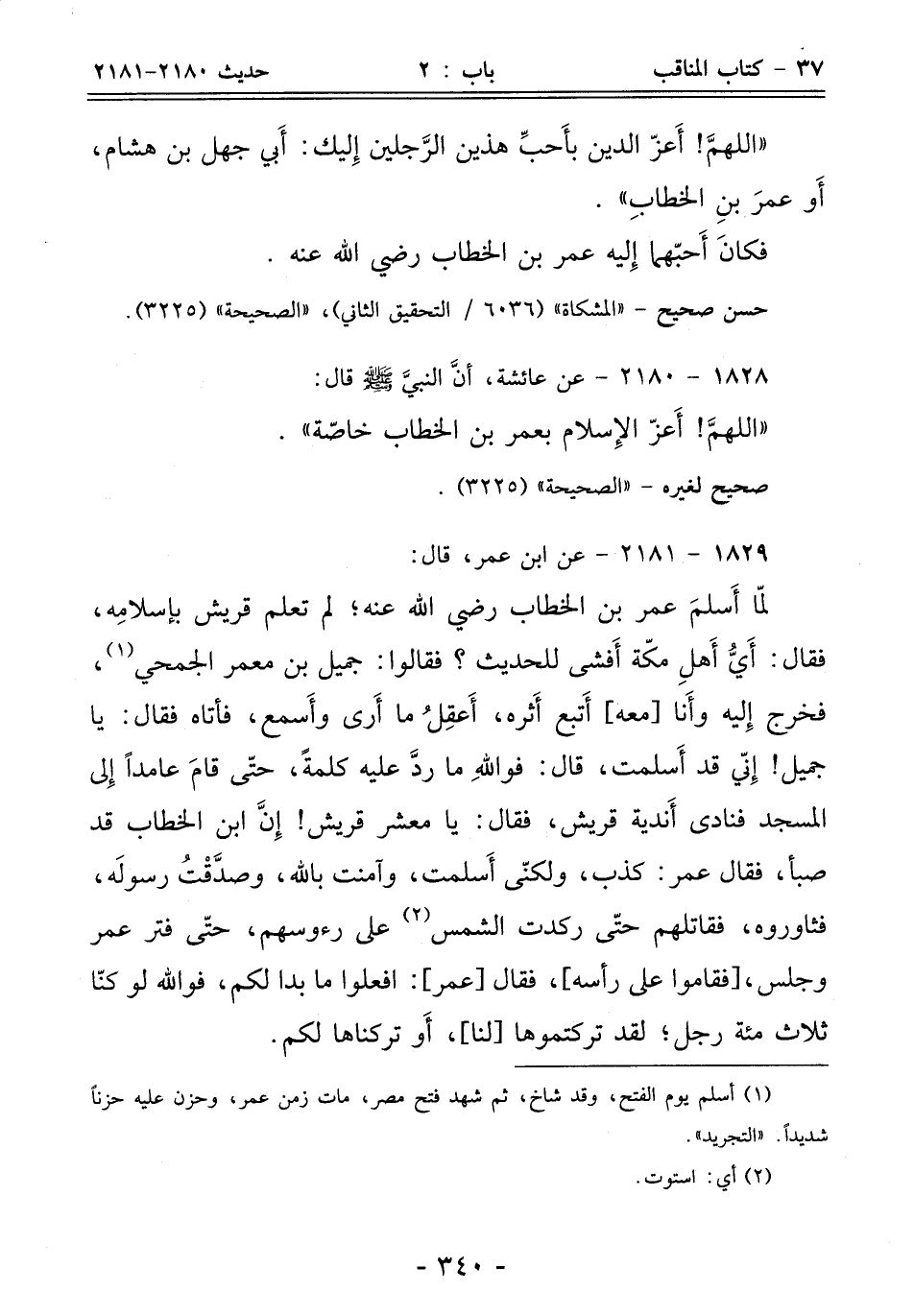 "اللهمَّ! أَعزّ الدين بأَحبِّ هذين الرَّجلين إِليك: أَبي جهل بن هشام، أَو عمرَ بنِ الخطابِ".