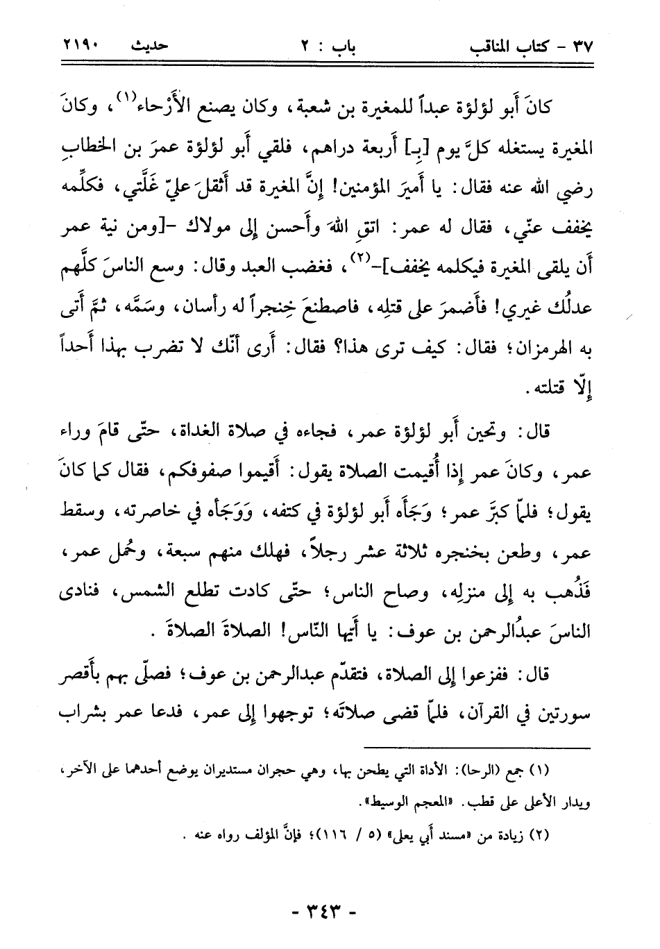 قال: وتحين أَبو لؤلؤة عمر، فجاءه في صلاة الغداة، حتّى قامَ وراء عمر، وكانَ عمر إِذا أُقيمت الصلاة يقول: أَقيموا صفوفكم، فقال كما كانَ يقول؛ فلمّا كبَّر عمر؛ وَجَأَه أَبو لؤلؤة في كتفه، وَوَجَأه في خاصرته، وسقط عمر، وطعن بخنجره ثلاثة عشر رجلاً، فهلك منهم سبعة، وحُمل عمر، فَذُهب به إِلى منزلِه، وصاح الناس؛ حتّى كادت تطلع الشمس، فنادى الناسَ عبدُ الرحمن بن عوف: يا أَيّها النّاس! الصلاةَ الصلاةَ.