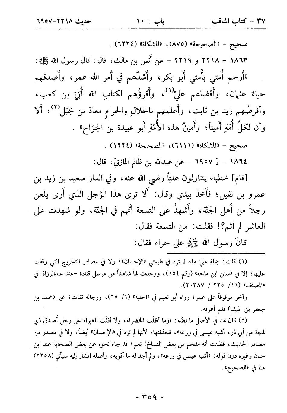 "أَرحم أُمتي بأُمتي أَبو بكر، وأَشدّهم في أَمر الله عمر، وأَصدقهم حياءً عثمان، وأَقضاهم عليّ (¬1)، وأَقرؤُهم لكتابِ الله أُبَيّ بن كعب، وأفرضُهم زيد بن ثابت، وأَعلمهم بالحلالِ والحرام معاذ بن جَبَل (¬2)، أَلا وأن لكلِّ أُمّةٍ أَمينًا؛ وأَمينُ هذه الأُمّةِ أَبو عبيدة بن الجرّاح".