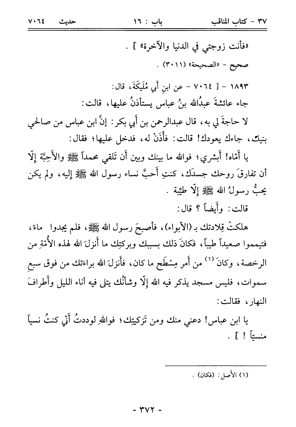 هلكتْ قِلادتك بـ (الأبواء)، فأصبحَ رسول الله - صلى الله عليه وسلم -، فلم يجدوا ماءً، فتيمموا صعيدًا طيبًا، فكانَ ذلك بسببك وبركتِك ما أَنزلَ الله لهذه الأُمّةِ من الرخصة، وكانَ (¬1) من أَمر مِسْطَح ما كان، فأَنزلَ الله براءَتك من فوق سبعِ سموات، فليس مسجد يذكر فيه الله إِلّا وشأنُك يتلى فيه آناء الليل وأَطرافَ النهار، فقالت: