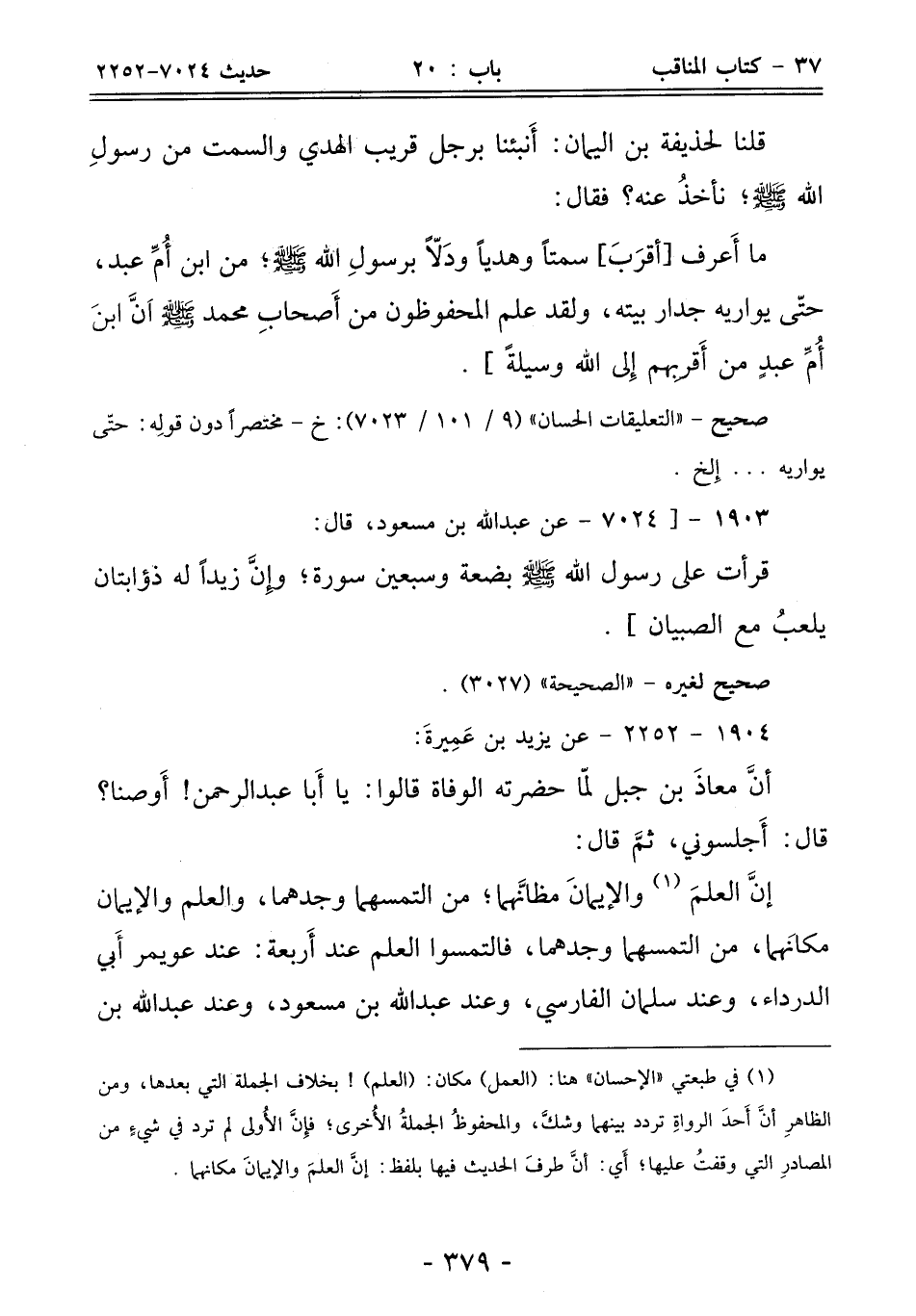 (¬1) في طبعتي "الإحسان" هنا: (العمل) مكان: (العلم)! بخلاف الجملة التي بعدها، ومن الظاهرِ أنَّ أَحدَ الرواةِ تردد بينهما وشكَّ، والمحفوظُ الجملةُ الأُخرى؛ فإِنَّ الأُولى لم ترد في شيءٍ من المصادرِ التي وقفتُ عليها؛ أَي: أنَّ طرفَ الحديث فيها بلفظ: إنَّ العلمَ والإيمانَ مكانهما.