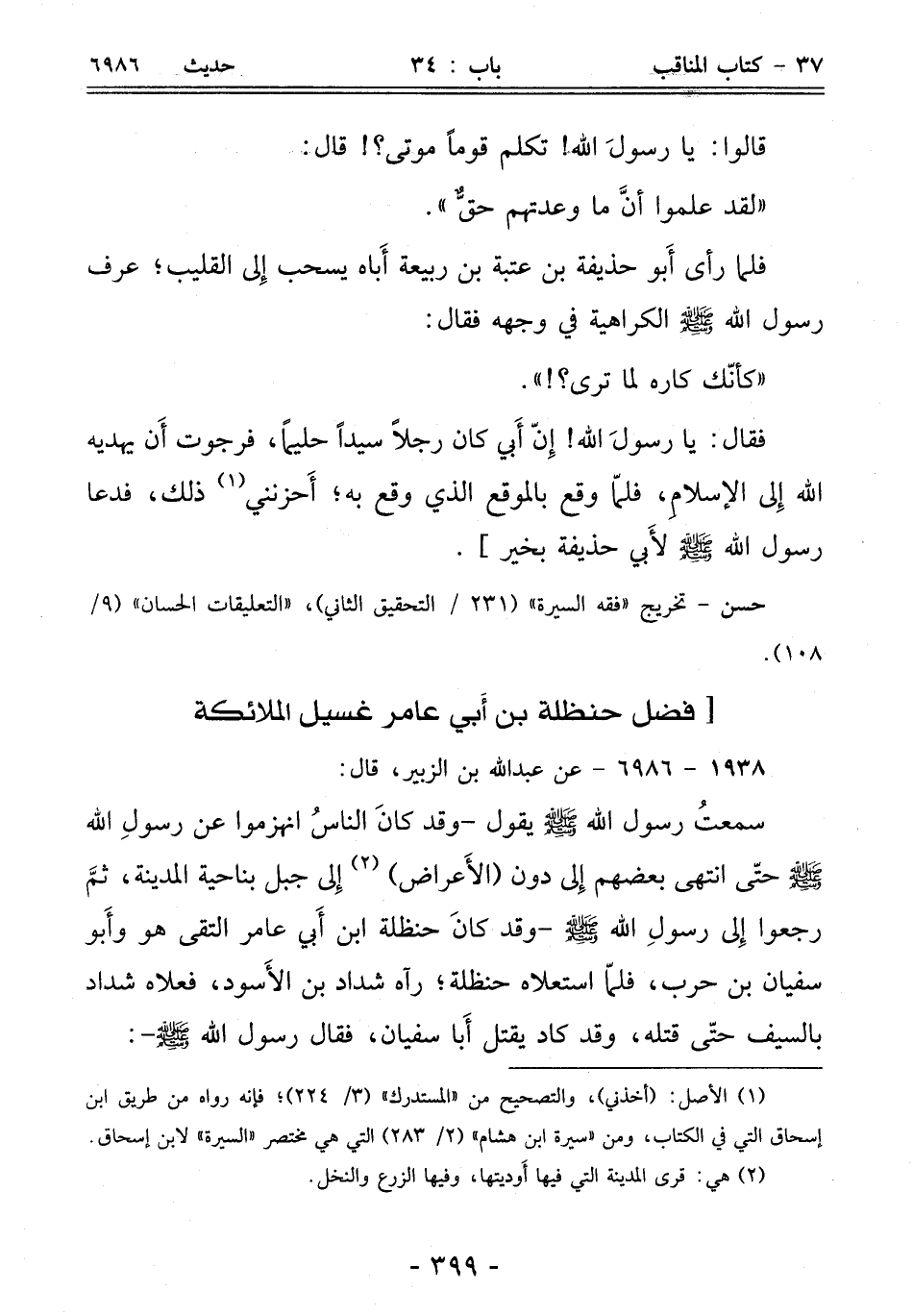 سمعتُ رسول الله - صلى الله عليه وسلم - يقول - وقد كانَ الناسُ انهزموا عن رسولِ الله - صلى الله عليه وسلم - حتّى انتهى بعضهم إِلى دون (الأَعراض) (¬2) إِلى جبل بناحية المدينة، ثمَّ رجعوا إِلى رسولِ الله - صلى الله عليه وسلم - وقد كانَ حنظلة ابن أَبي عامر التقى هو وأَبو سفيان بن حرب، فلمّا استعلاه حنظلة؛ رآه شداد بن الأَسود، فعلاه شداد بالسيف حتّى قتله، وقد كاد يقتل أَبا سفيان، فقال رسول الله - صلى الله عليه وسلم -: